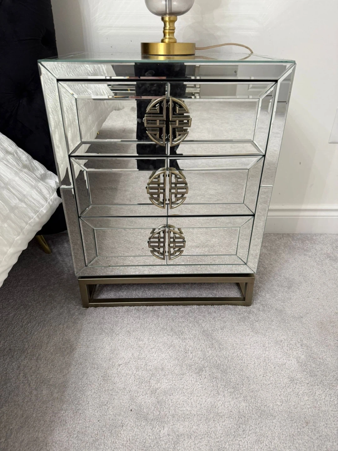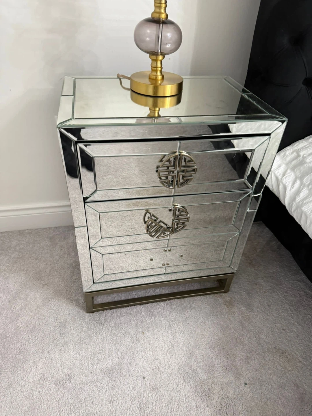 This mirrored nightstands features a sleek, modern design with three drawers. It's finished with eye-catching gold-tone circular handles and a matching metal base. The mirrored finish reflects light beautifully, making any room feel brighter and more spacious. Handles need to be placed still. Some chips but beautiful pieces. I have two.