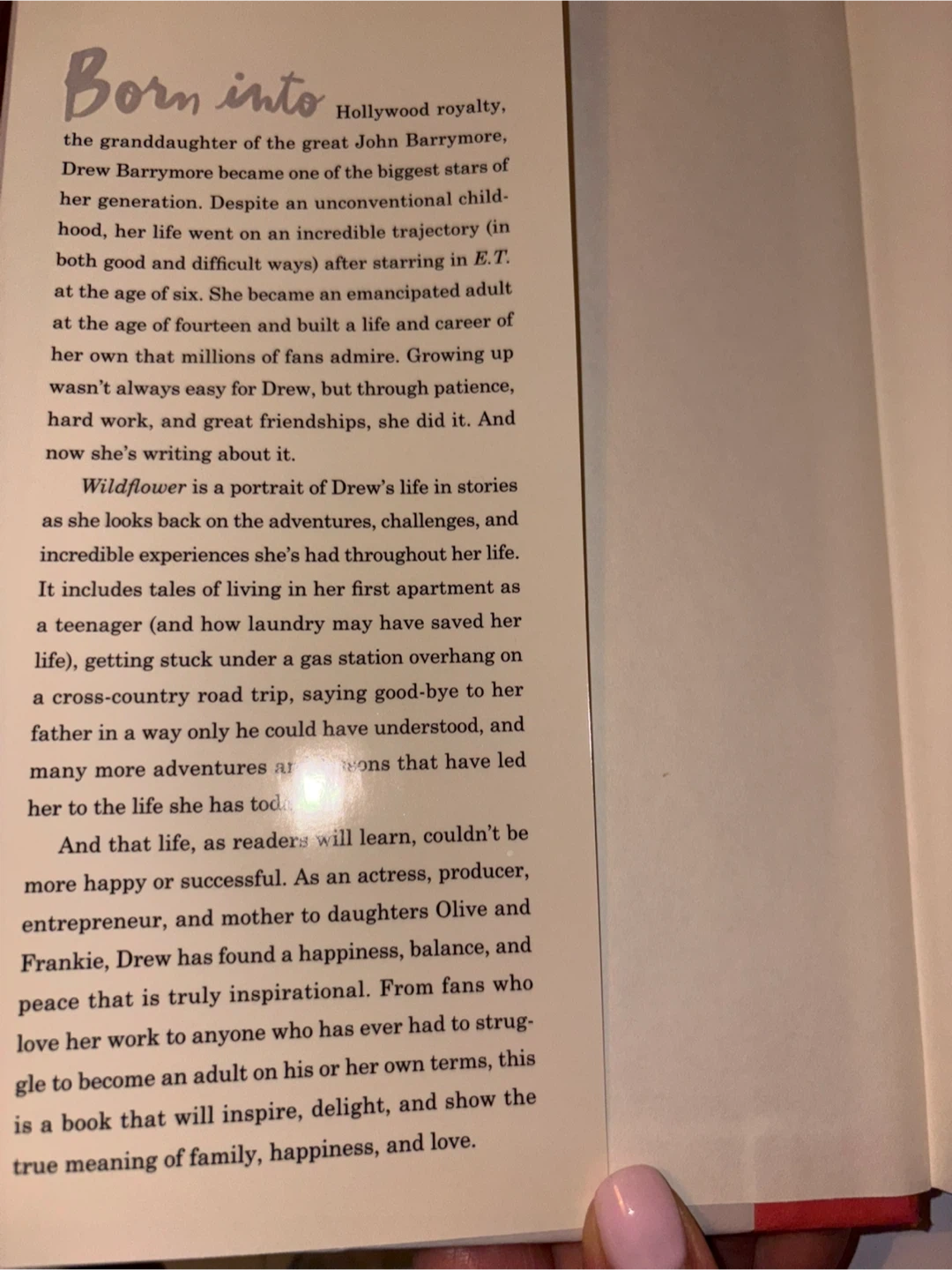 78Wildflower by Drew Barrymore! It's a portrait of Drew's life in stories, looking back on her adventures, challenges, and incredible experiences. It includes tales of living in her first apartment as a teenager and other stories that have led her to where she is today