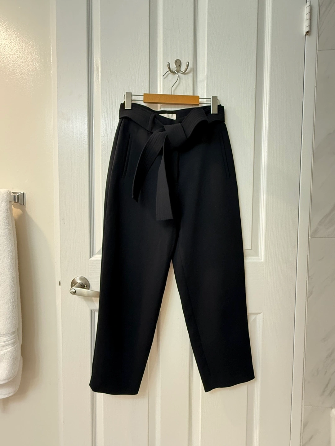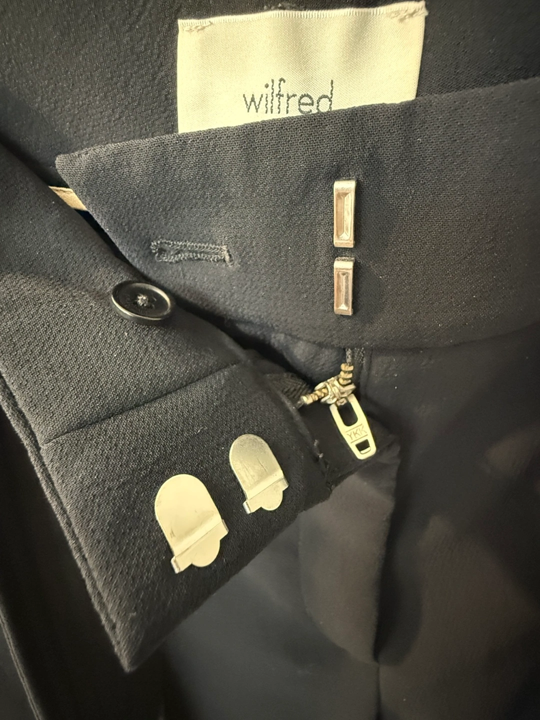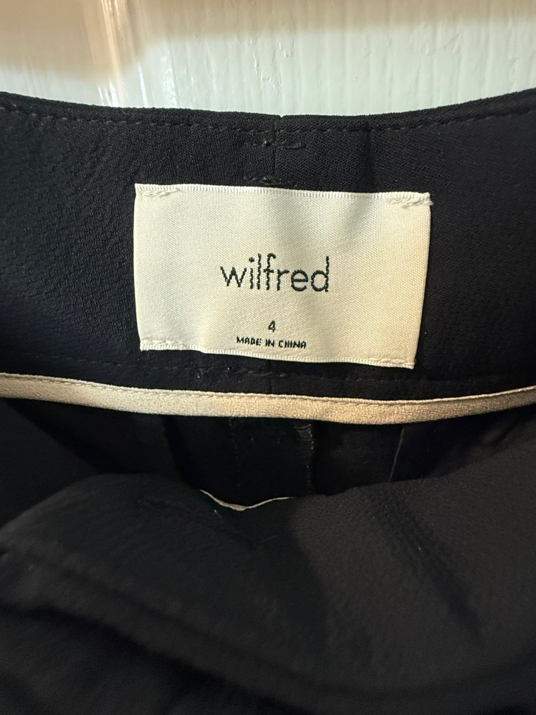 Experience the sophistication of Wilfred's black tailored trousers, crafted for a timeless and versatile look. These trousers feature a classic straight-leg cut, perfect for professional or formal settings. Made from a high-quality fabric, they offer a sleek and polished appearance. These are high-rise pants with a removable tie belt, welt pockets and a relaxed fit. They're made with Crepette™ — Wilfred’s iconic crepe fabric famous for its subtle texture and breezy, effortless drape. It’s sourced from an innovative Japanese mill. Features Straight waistband Darted back for shaping Zip fly with hook-and-bar closure Materials & Care Origin: Fabric from Japan Content: 100% polyester Care: Machine wash Rise: High Leg: Straight Length: Ankle — Intended to hit at the ankle Inseam: Size 4 is 27" — Inseam varies by size Height: Regular — Designed for heights around 5'3" to 5'7" On average, customers say it fits slightly smaller Original Price: $148 CASH AND PICKUP ONLY