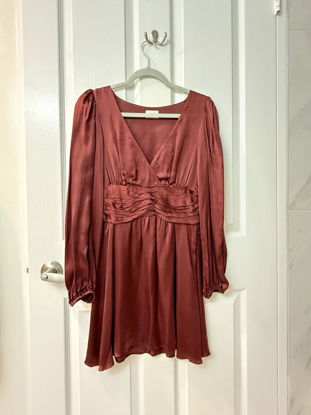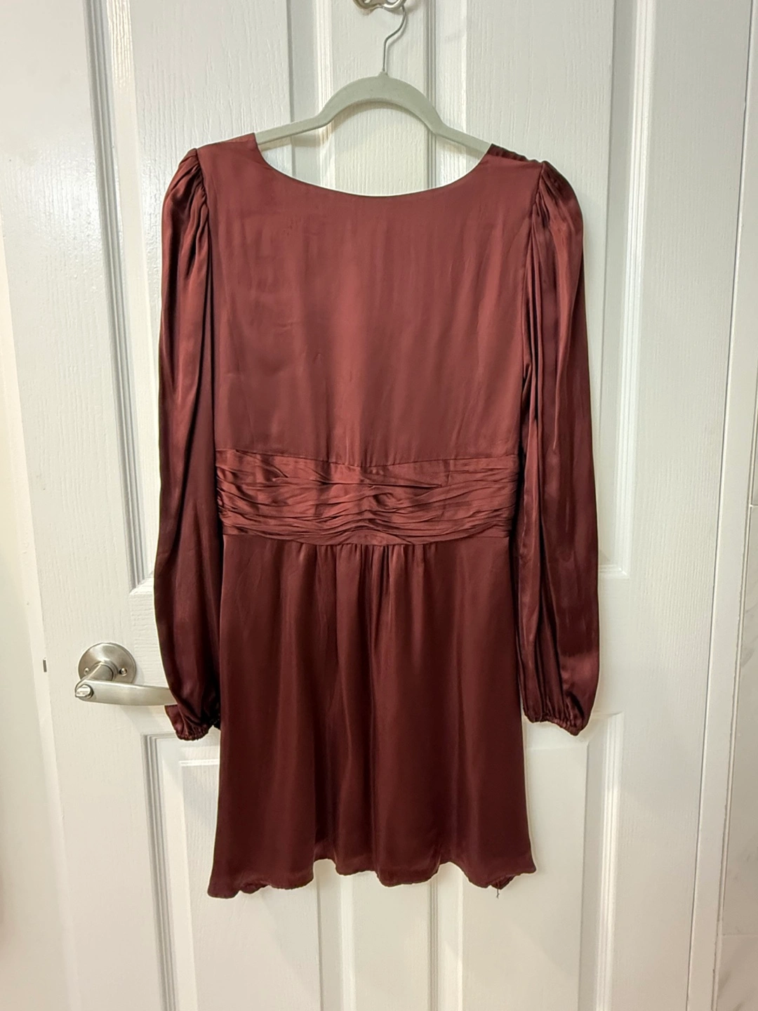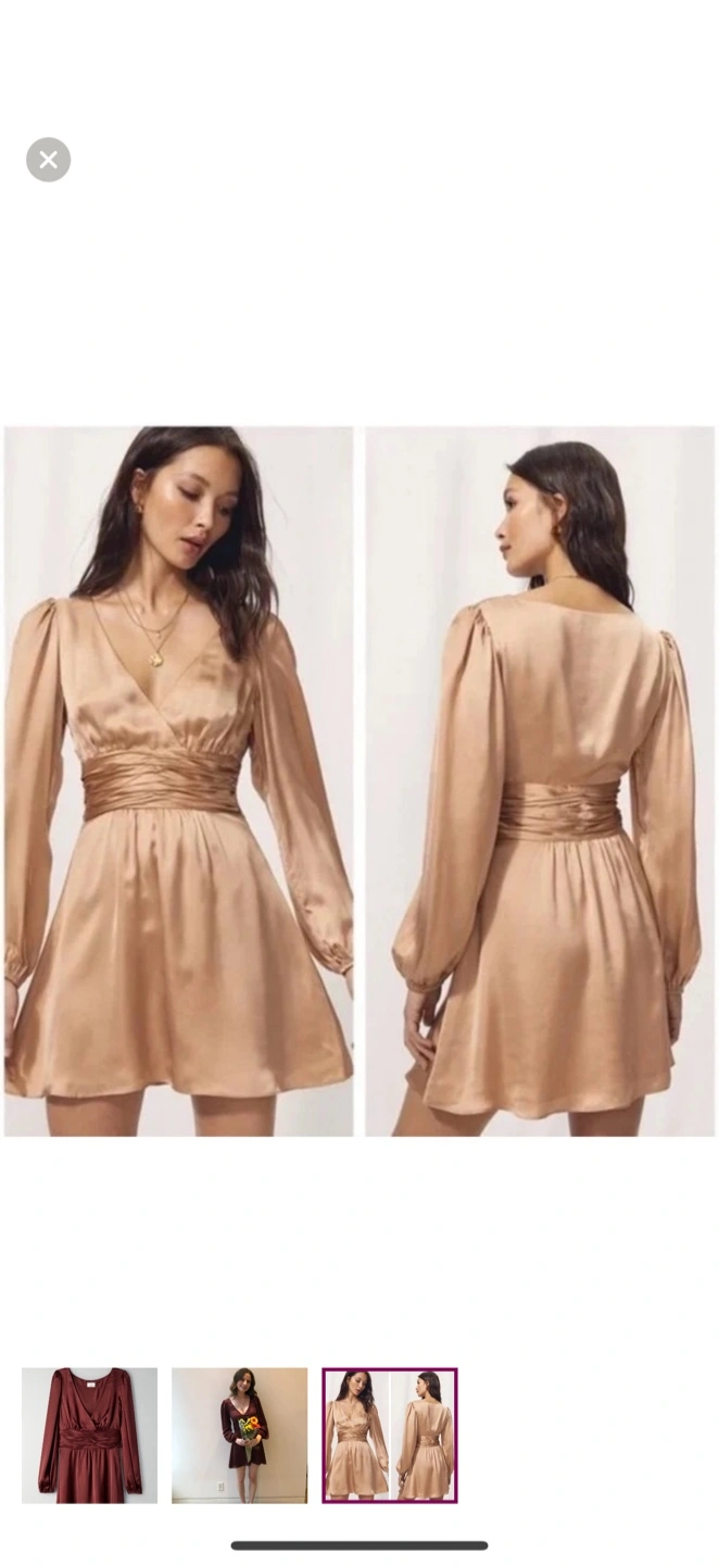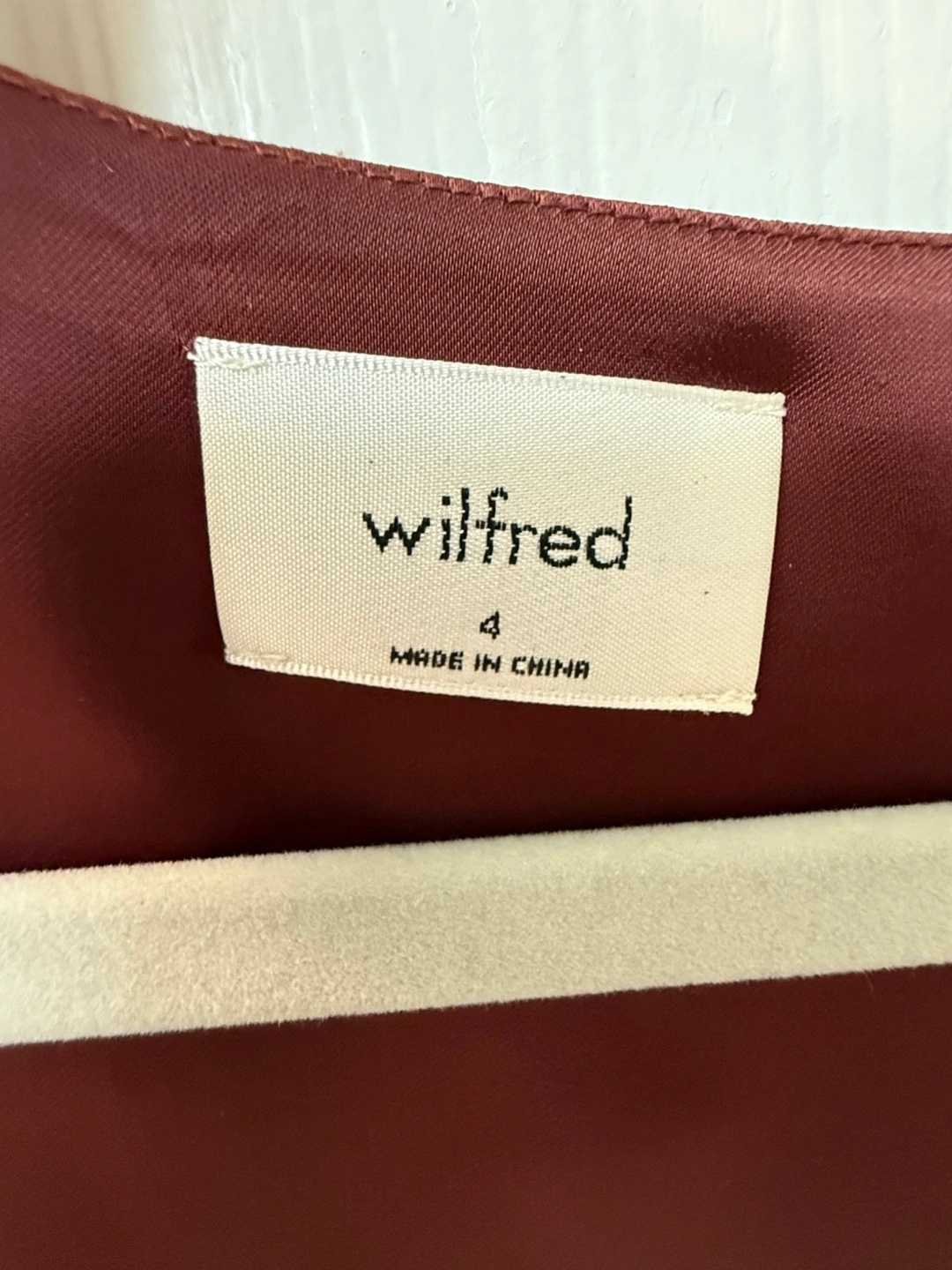 This stunning red dress by Wilfred features a V-neckline and elegant bishop sleeves. Perfect for a wedding guest or a night out, the dress boasts a flattering wrapped waist and a flowing A-line skirt, crafted from a lustrous satin fabric that adds a touch of sophistication. Double-lined. Worn twice for special occasions. Would definitely keep if it still fit. Very sad to let it go! CASH AND PICKUP ONLY