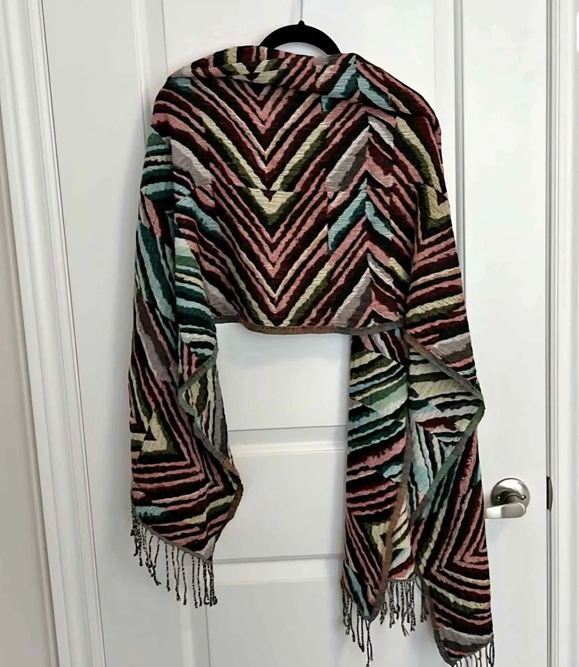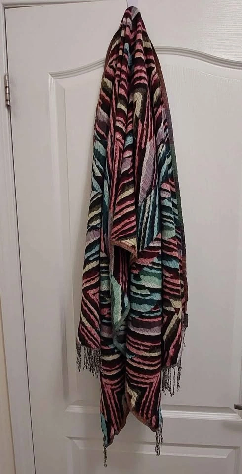 10Cozy, multi-coloured rectangle scarf with a twisted fringe trim. Light knit wool. 27"×68". Excellent condition! Smoke-free home.