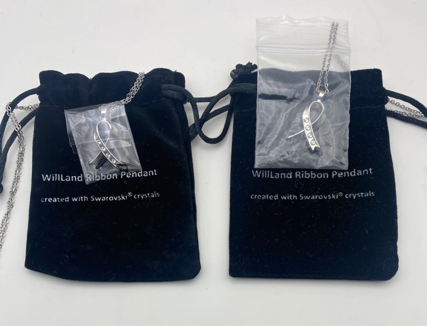 65Selling two(2) beautiful WillLand ribbon pendants, adorned with Swarovski crystals. Each comes in its original black velvet pouch and is still sealed in its plastic packaging. Perfect for adding a touch of elegance to any outfit!