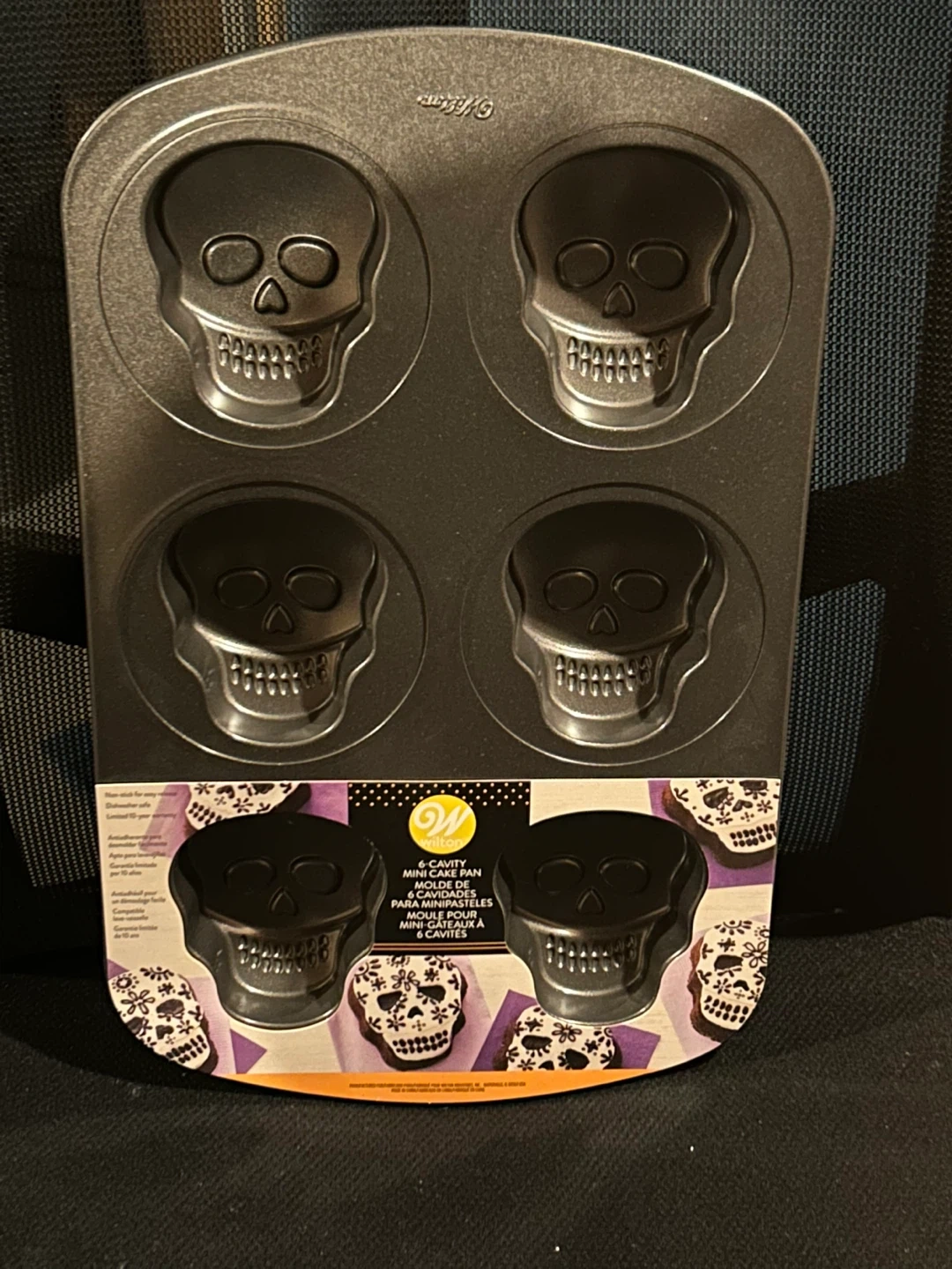 I'm selling a Wilton 6-cavity mini cake pan shaped like skulls! It's perfect for Halloween or any spooky occasion. Get ready to bake some fun and festive treats!