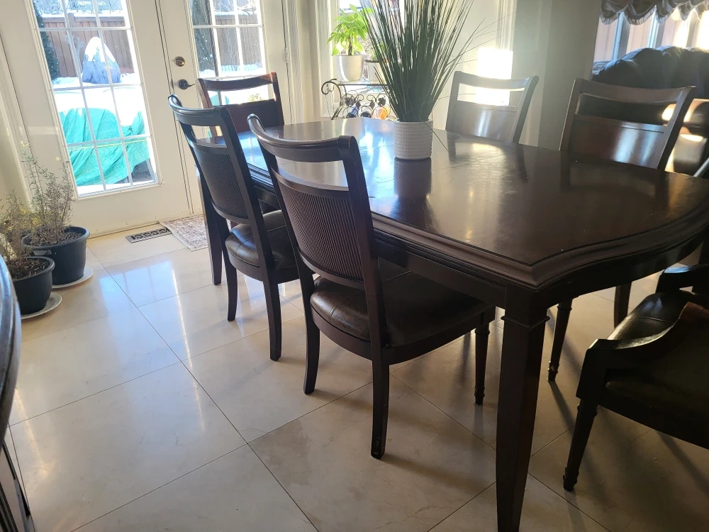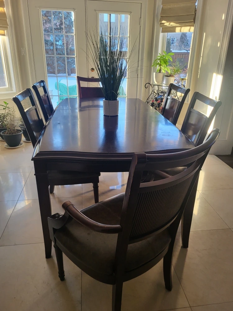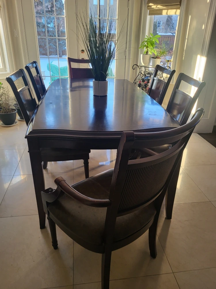 This is a rich, dark wood dining set that includes a table and seven matching chairs.(one is a armchair) The chairs feature comfortable leather seats and a textured backrest. It's a classic design that'll fit most dining rooms!