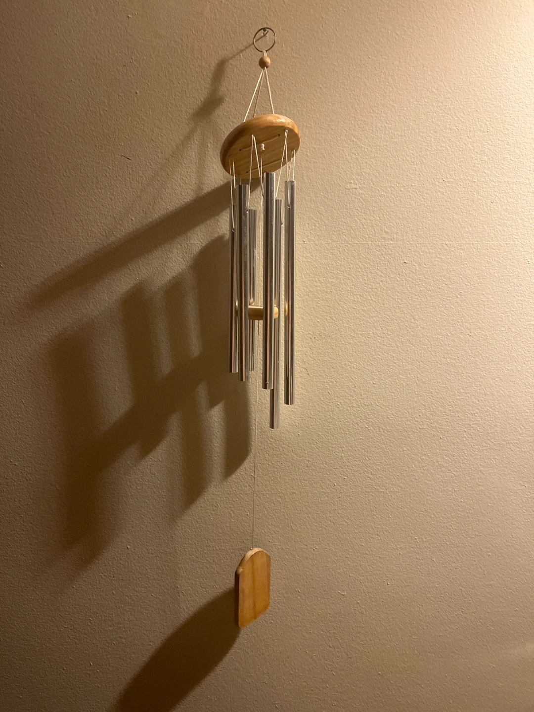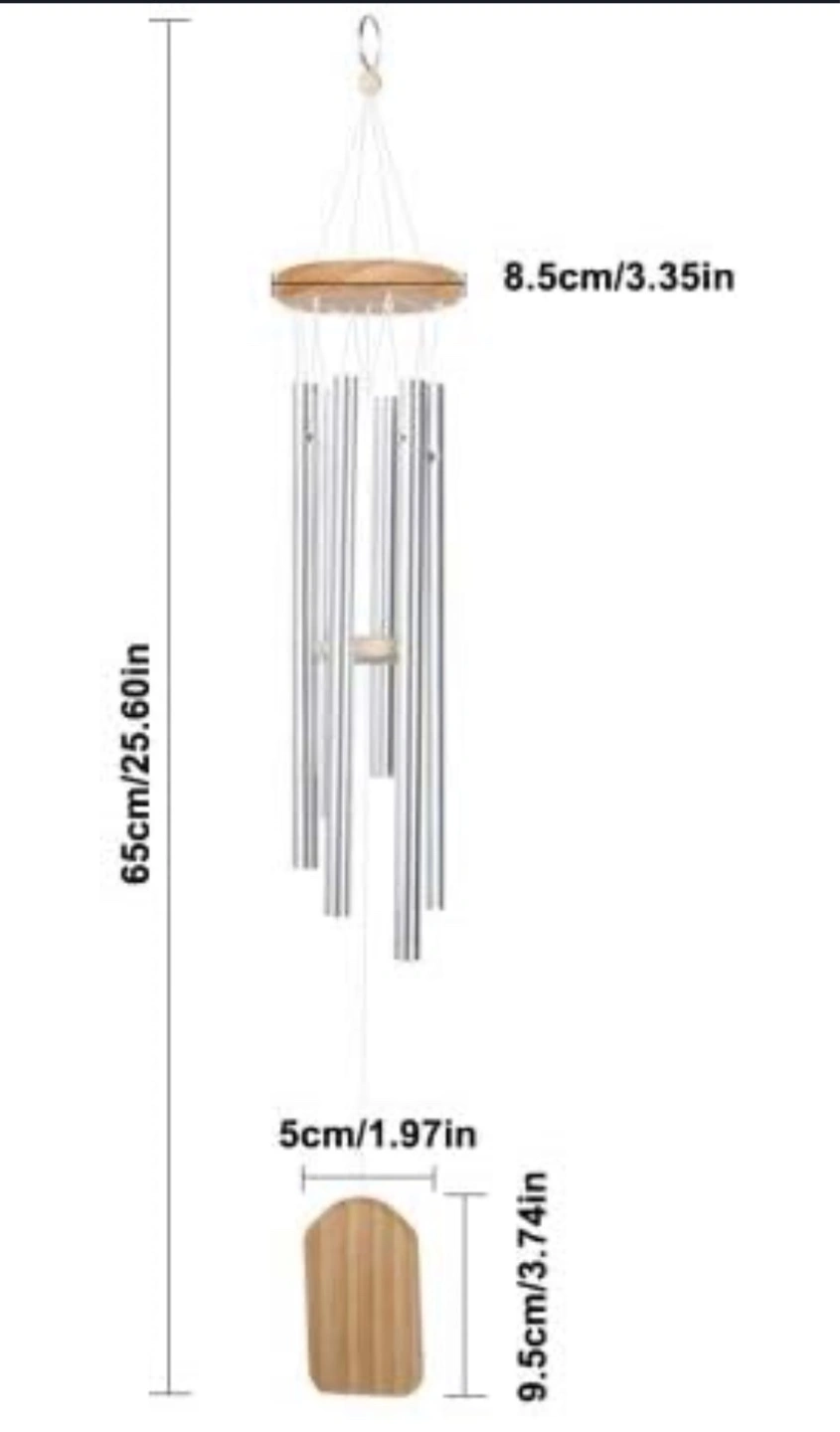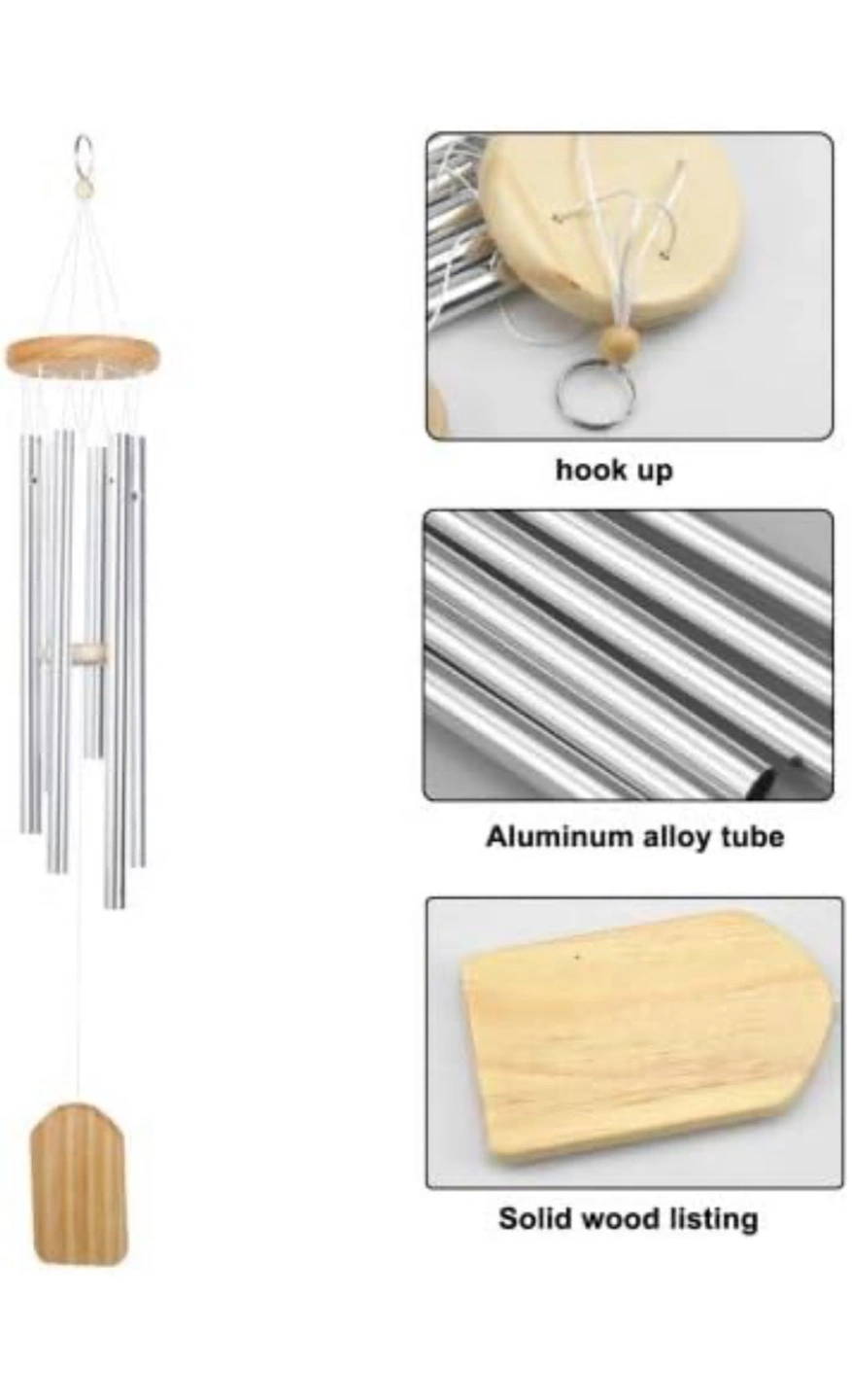 Beautiful wind chimes. Features silver aluminum tubes and a wooden top, middle and bottom piece. Makes a calming sound.