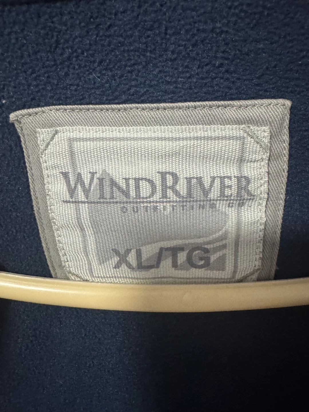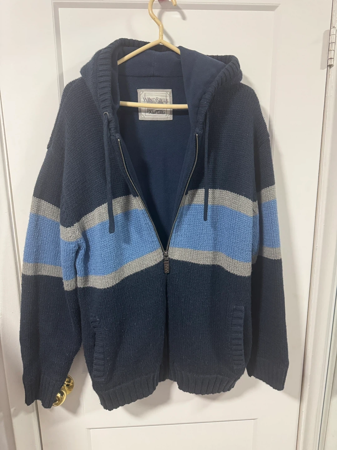 Cozy up in this Wind River hooded knit cardigan! It's a size XL/TG and features a full zip. The cardigan has a nice weight to it, perfect for layering on cooler days. The blue and grey stripes add a touch of style to this comfortable piece