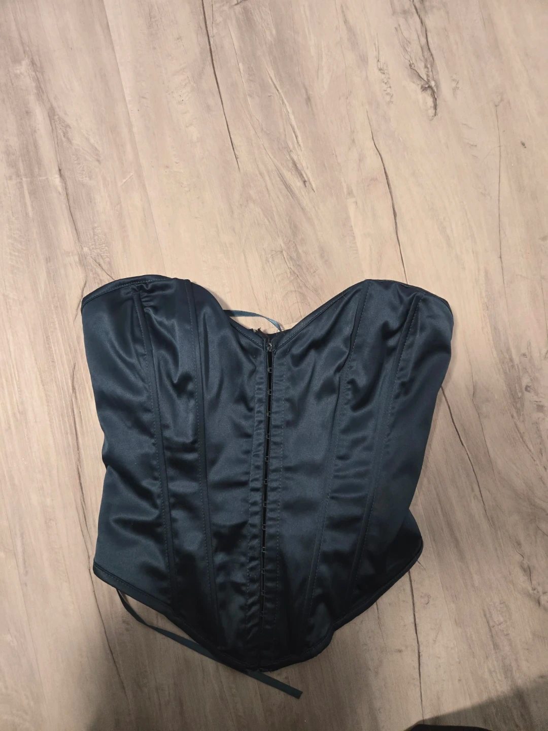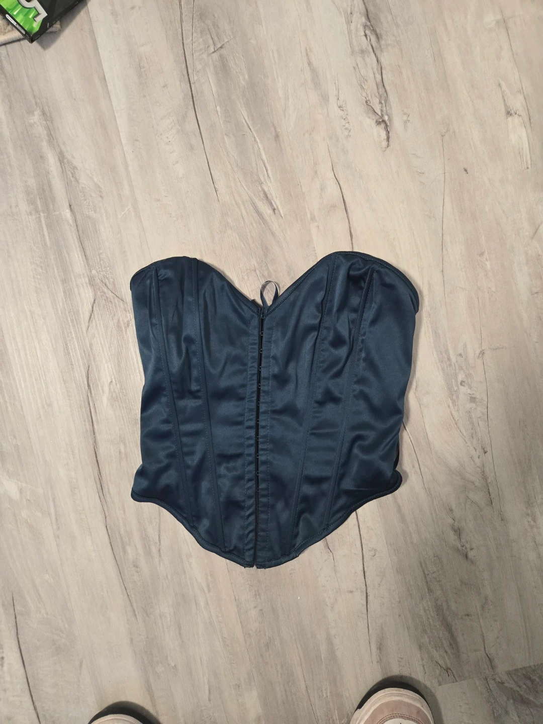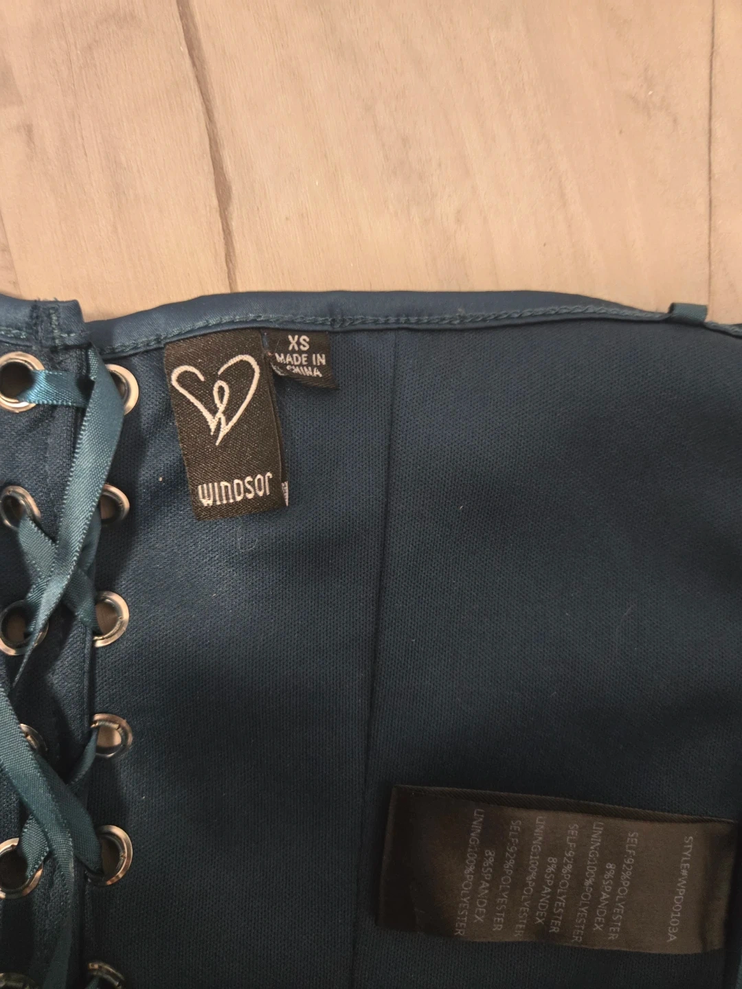 20This is a Windsor corset top in size XS. It's a beautiful teal colour and has a lace-up back. The material is self: 92% polyester, 8% spandex and lining: 100% polyester