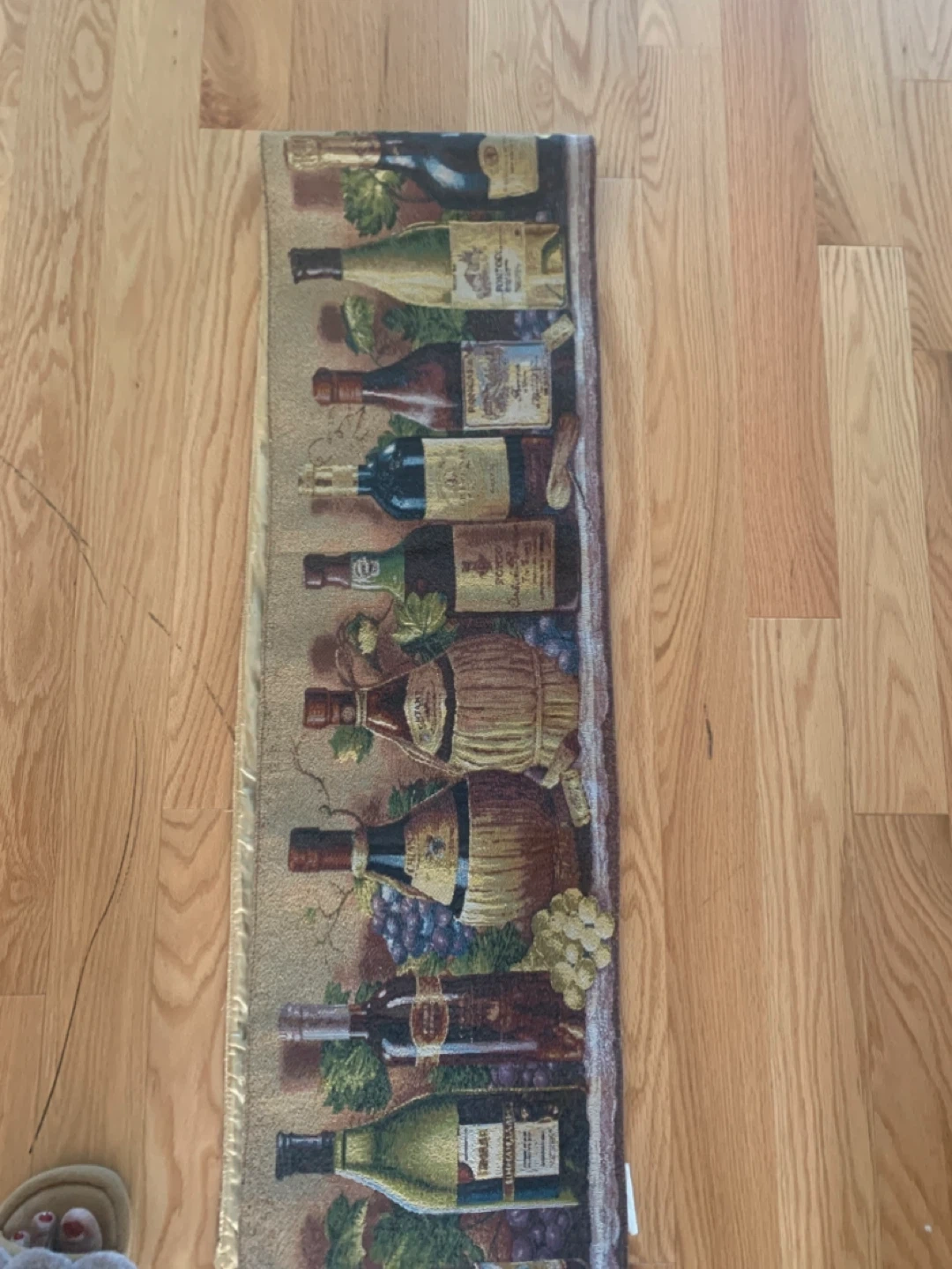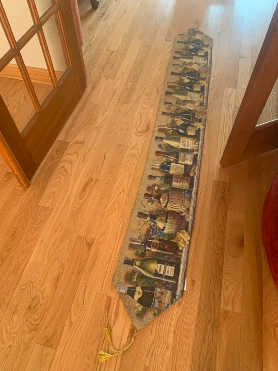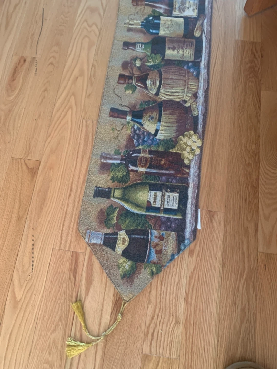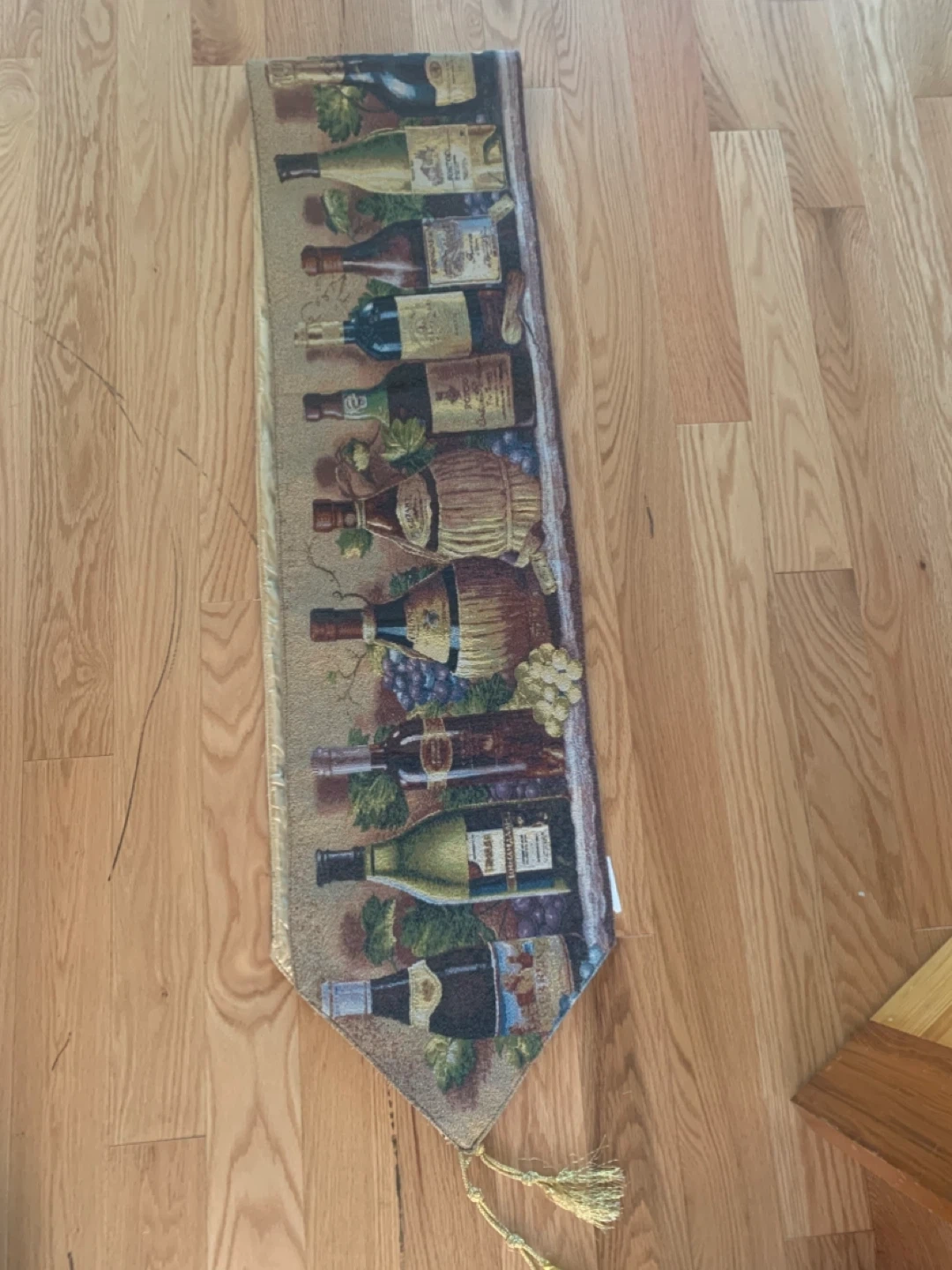 A beautiful tapestry table runner featuring a wine bottle design. It would look great in any kitchen or dining room!