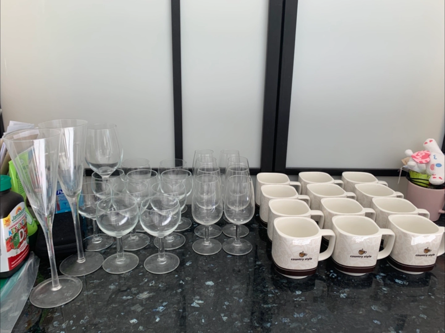 68Selling a collection of wine glasses and Country Style mugs. Perfect for stocking up your kitchen or for special occasions! $1.5 each wine glass $3 each coffee mug