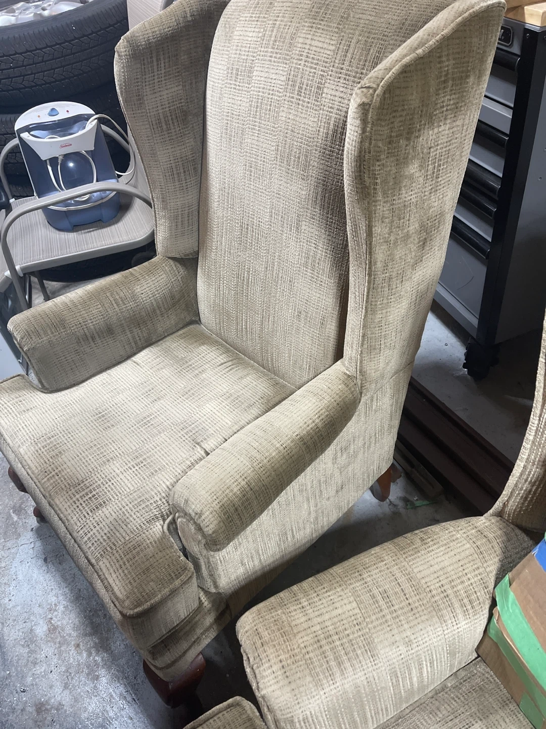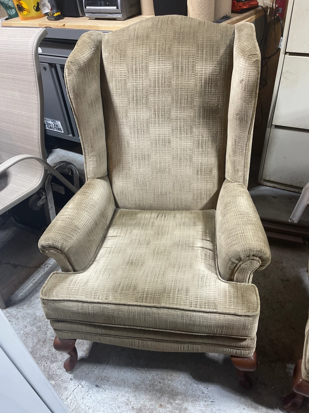 66Selling a comfy wingback armchair! It's in good condition and would look great in any living room or den. The colour is a neutral beige, so it'll match most decor styles. It's a sturdy and well-made chair