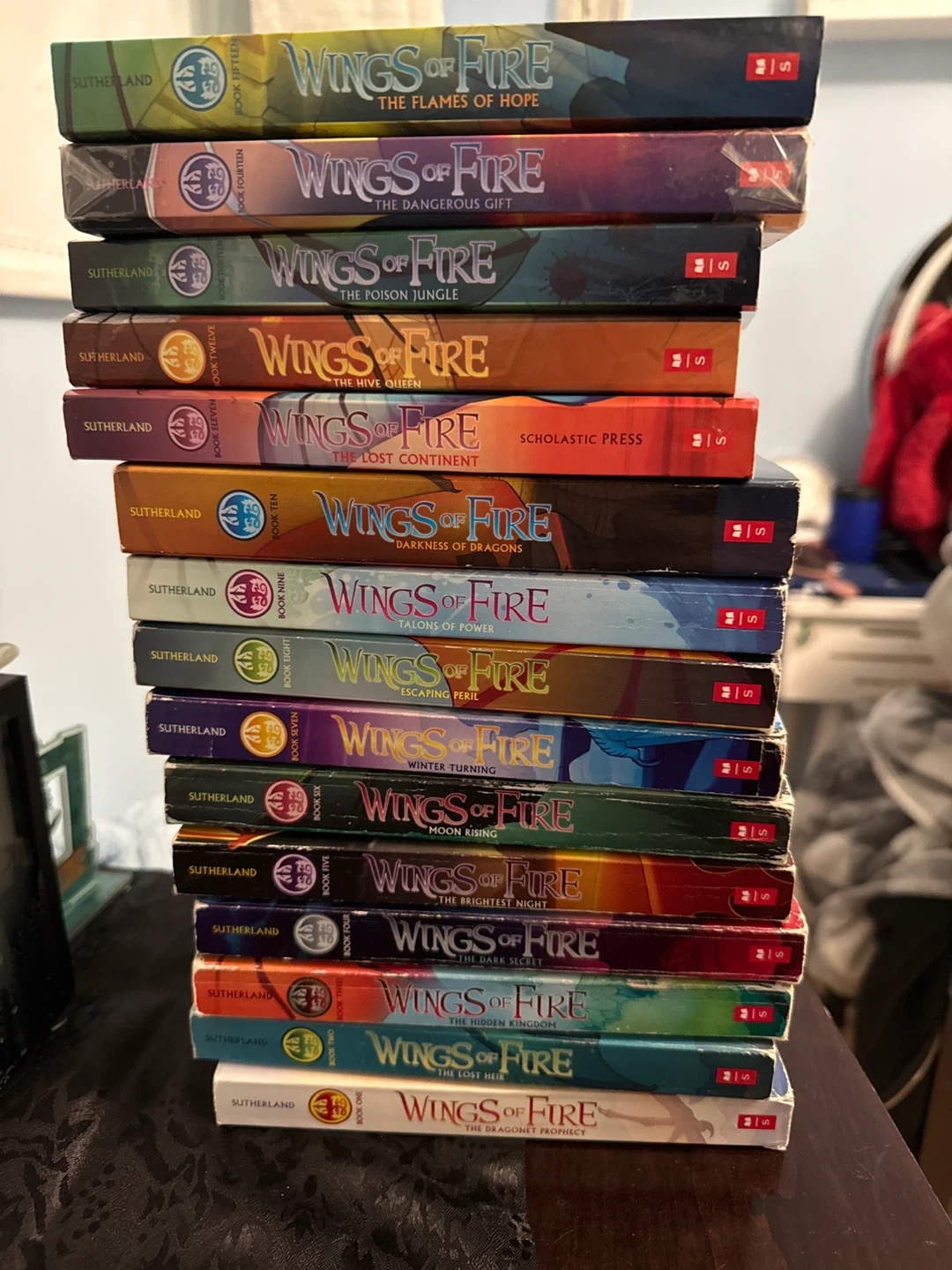 Selling the complete Wings of Fire book series by Tui T. Sutherland! All books are in great condition and ready for a new home. This is a fantastic series for young readers who love dragons, adventure, and a bit of mystery. Get the whole set and dive into the world of Pyrrhia!