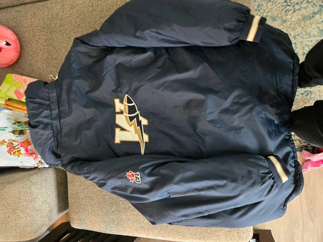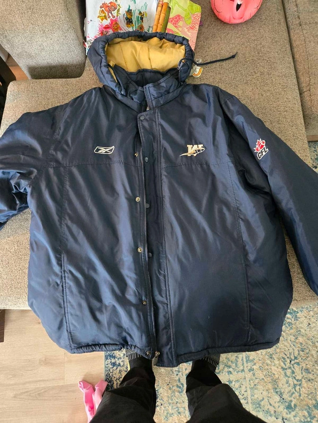 10Show your team pride with this used Winnipeg Blue Bombers winter coat! Perfect for staying warm during those chilly game nights, this coat features the team logo and colours. It's in good condition, ready to keep you cozy all season long. It is lightly worn but still very warm and useful. * Team: Winnipeg Blue Bombers * Size: XL * Colour: Blue * Features: Detachable Hooded, Insulated