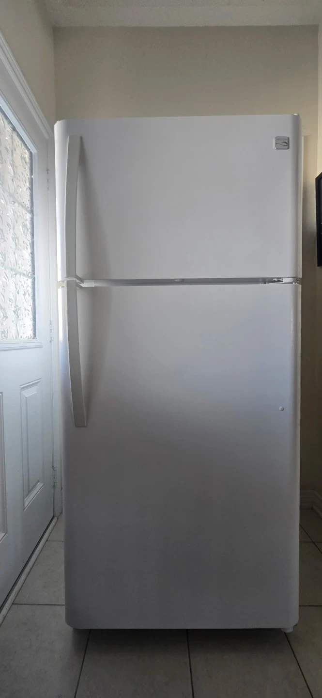 Fully functioning White Kenmore top freezer/ refrigerator. It's been cleaned and is ready for a new home. Humidity controlled crispers.
