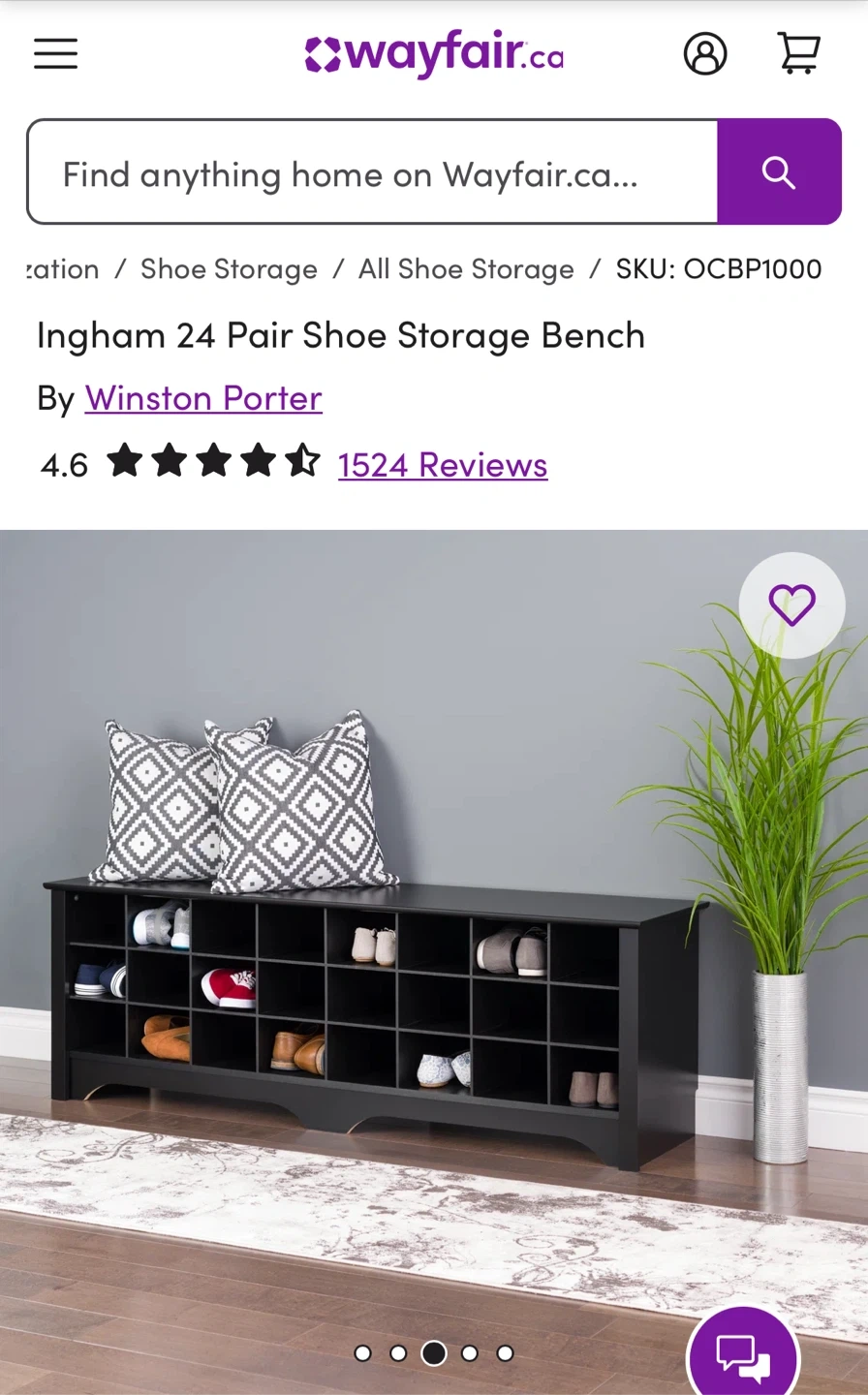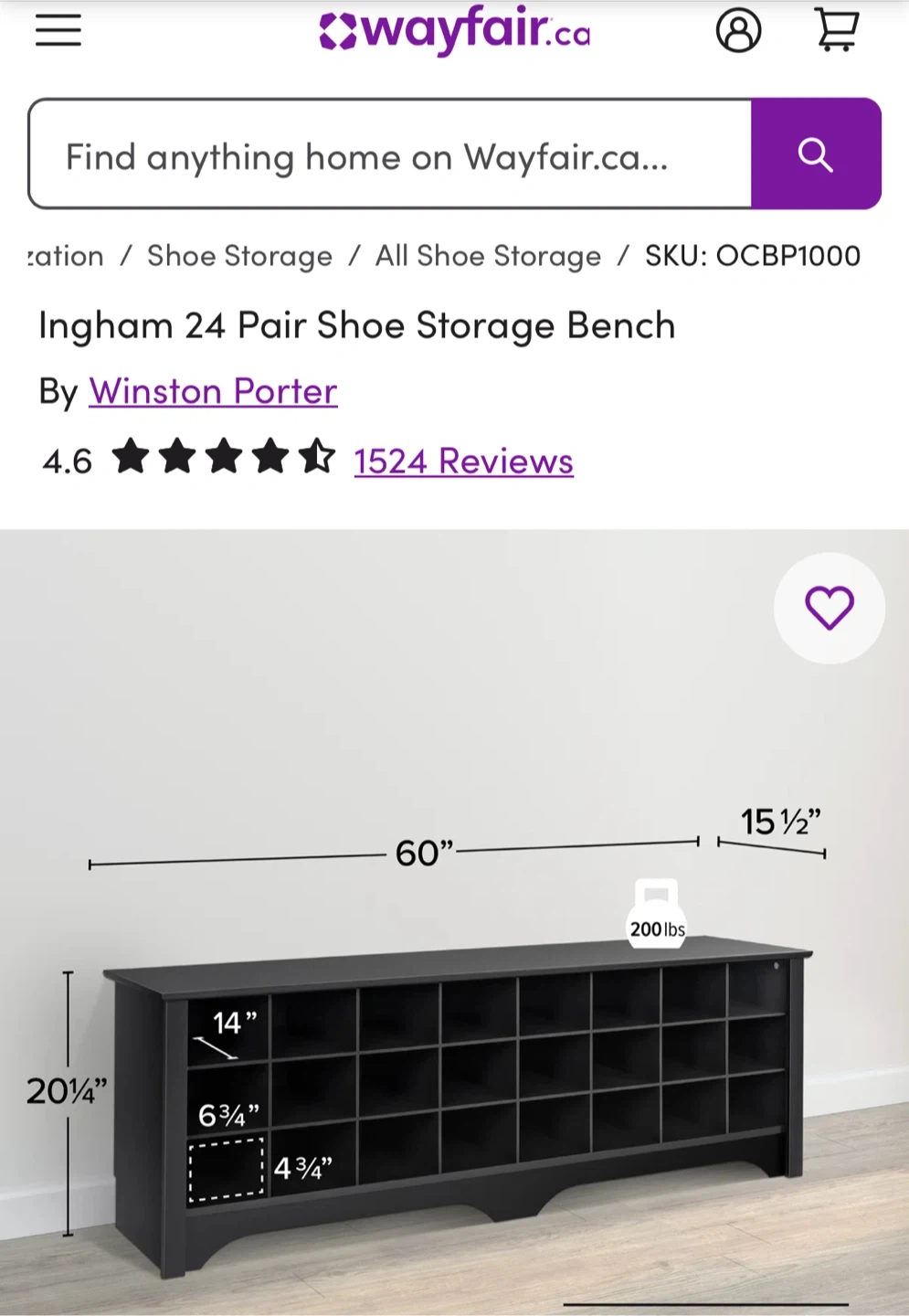 145Looking to organize your shoes? This Winston Porter Ingham shoe storage bench is a great solution! It can hold up to 24 pairs of shoes. The dimensions are: - Length: 60 inches - Width: 15.5 inches - Height: 20.25 inches Originally bought for $256.99