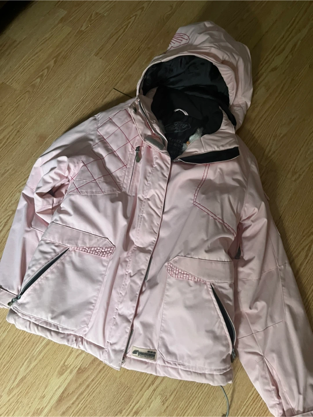 Light pink / grey butterfly stitching on hood size lg. snowboarding crazy creek brand purchased from sportcheck.