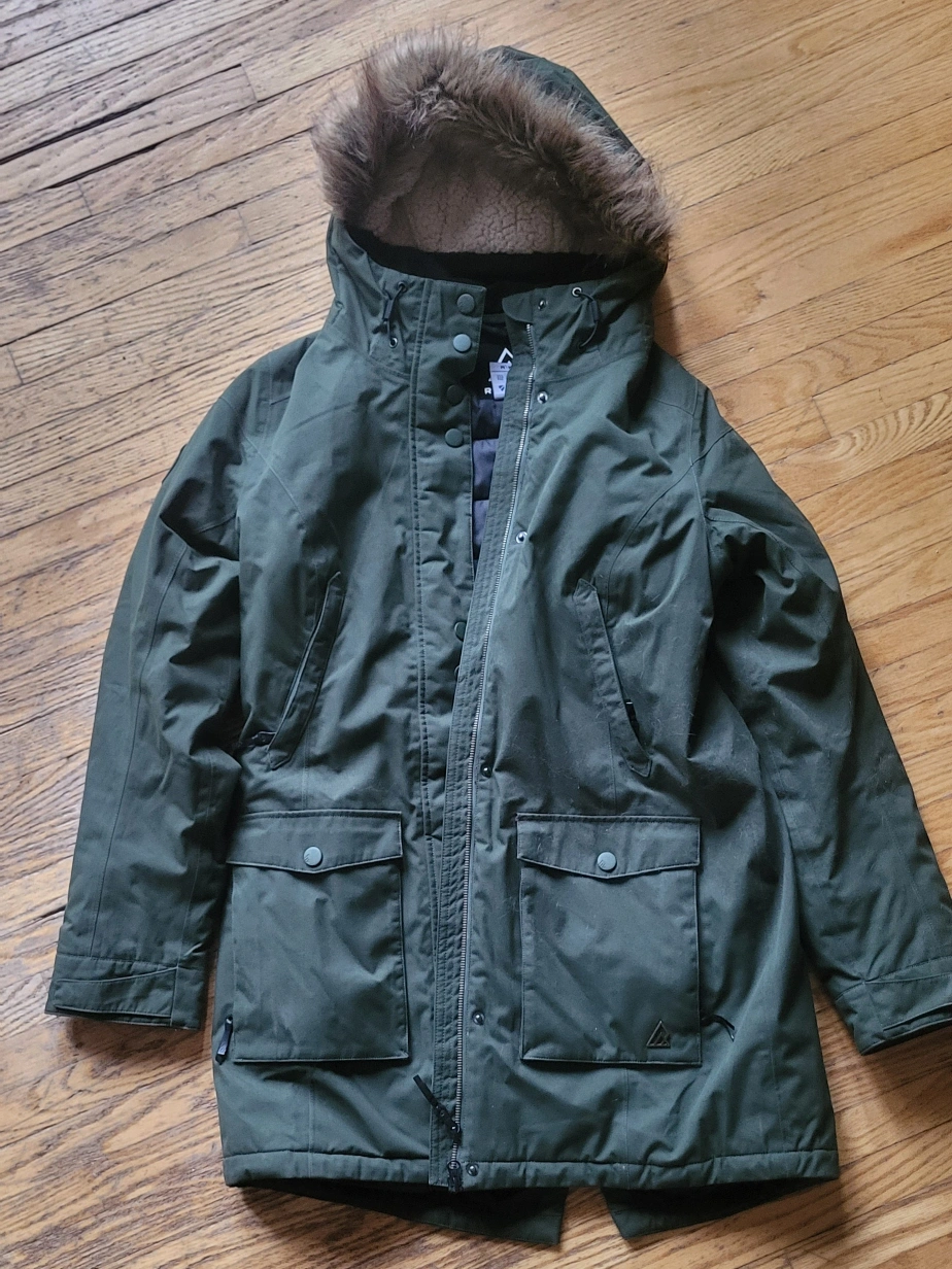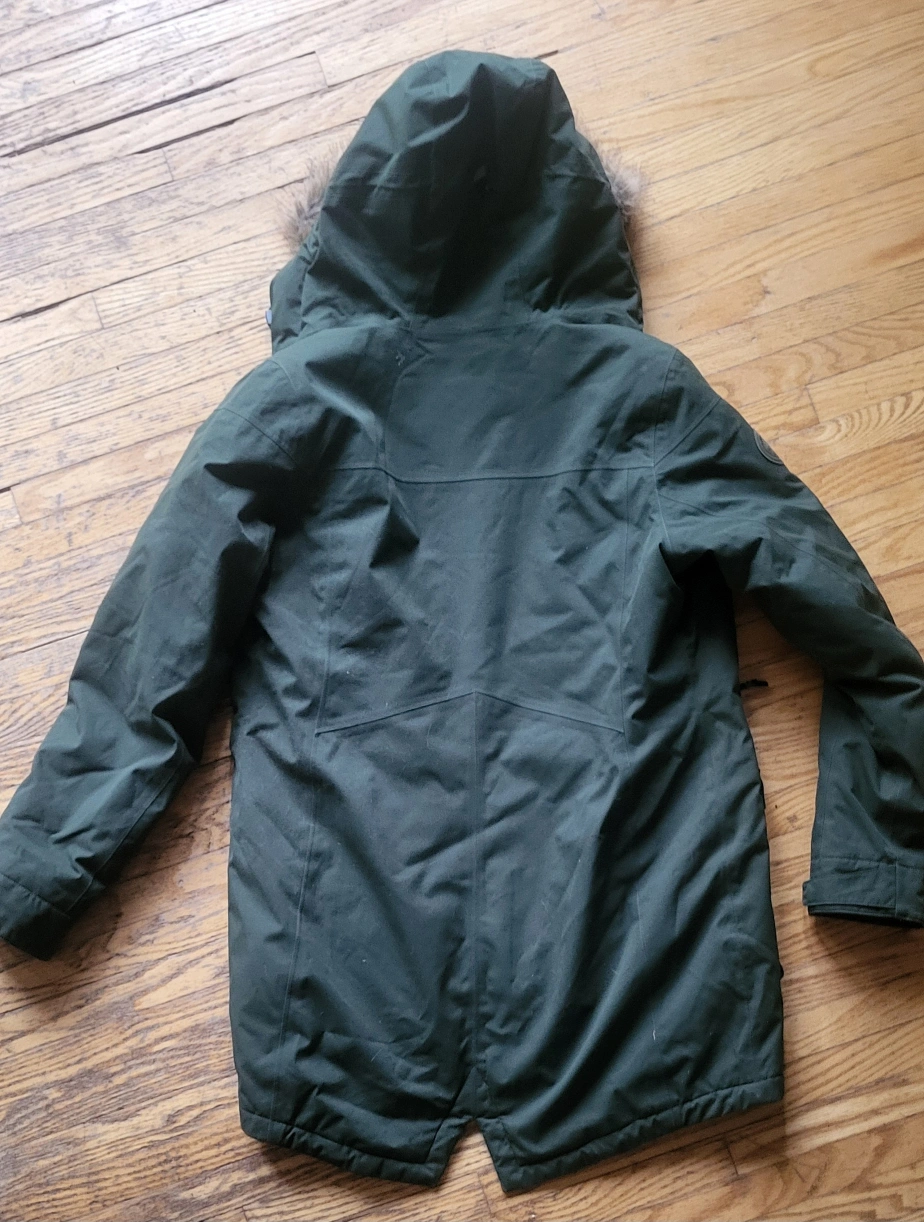5Green winter jacket with a faux fur lined hood and pockets. It is waterproof and breathable. size medium long not bomber style no rips, stains or signs of wearing