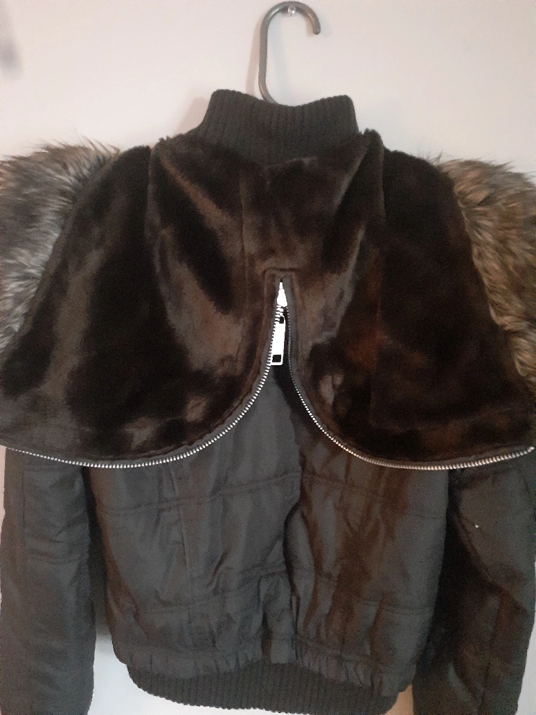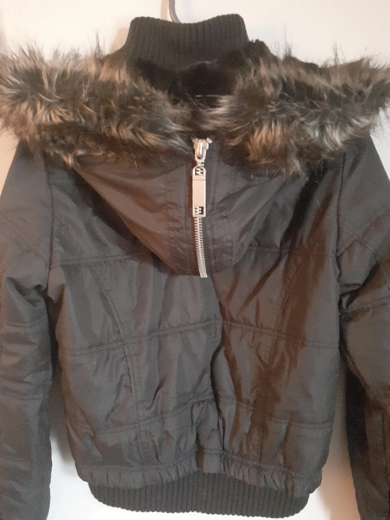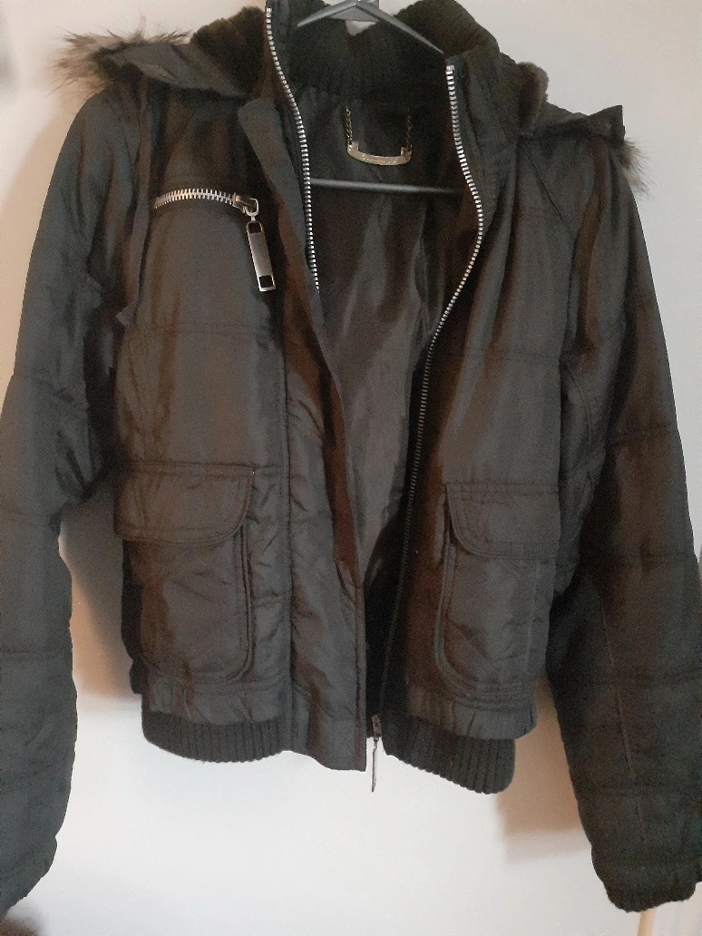 Stylish Women's Bomber style Jacket Attached Faux Fur Hood Excellent Condition. Can also fit Size Medium. Front Pockets. Extended ribbed cuffed sleeves. smoke and pet free home serious inquiries can deliver if within area.