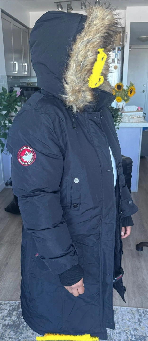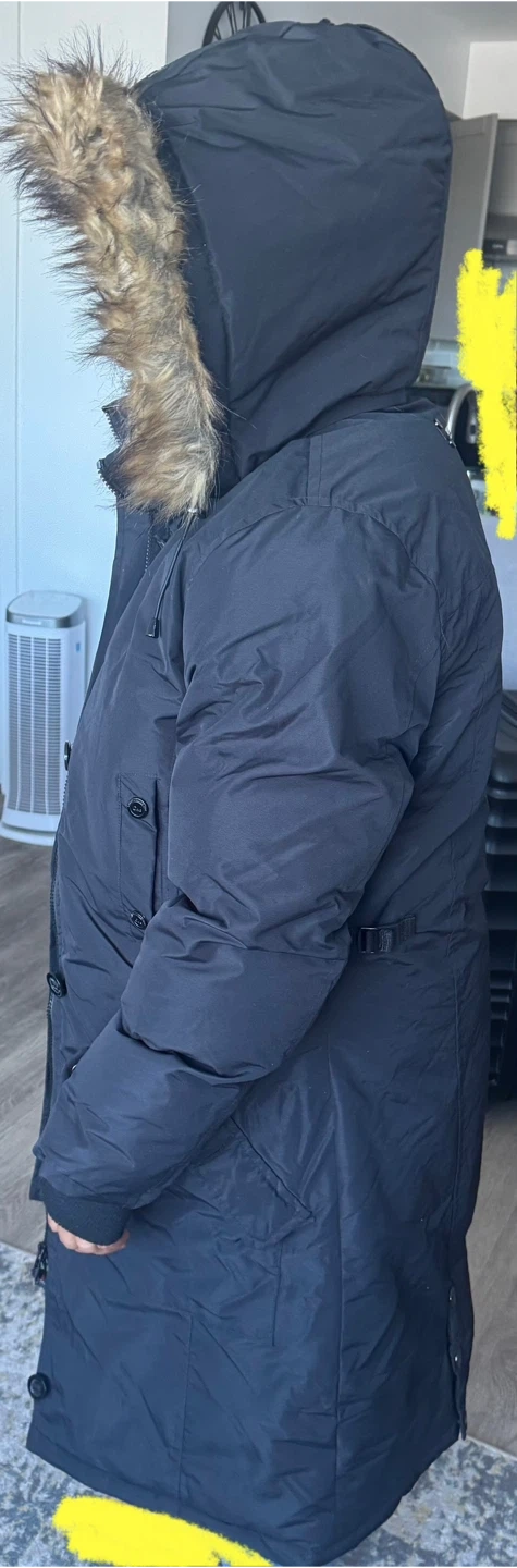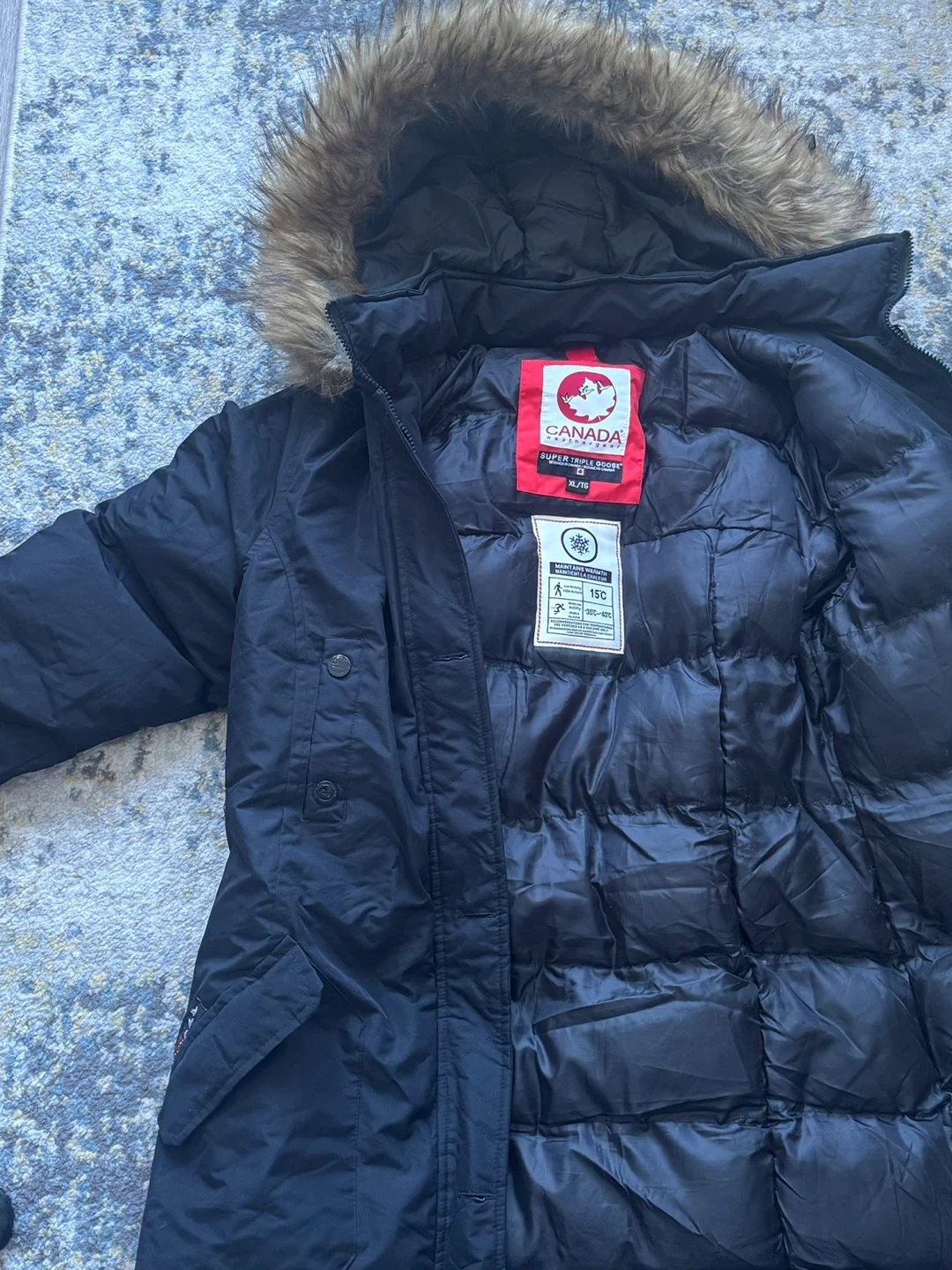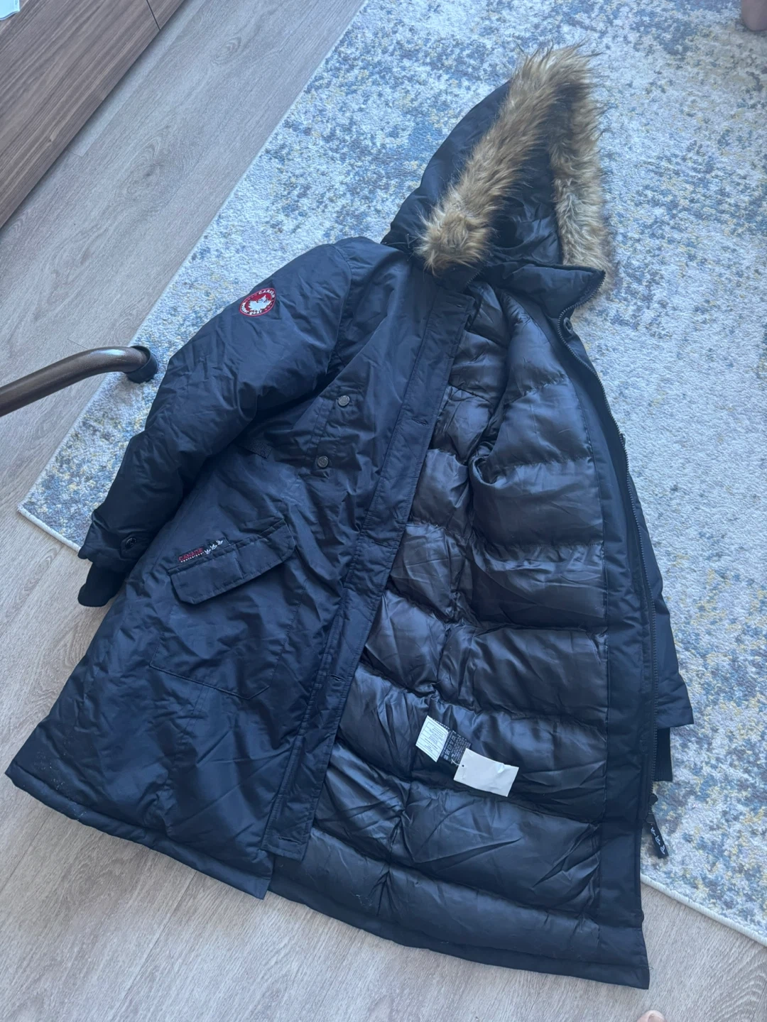 It's in great condition and perfect for the Canadian winter. It features a fur-trimmed hood, a quilted interior, and a long length for extra warmth. The parka also has multiple pockets for storage and is made with high-quality materials