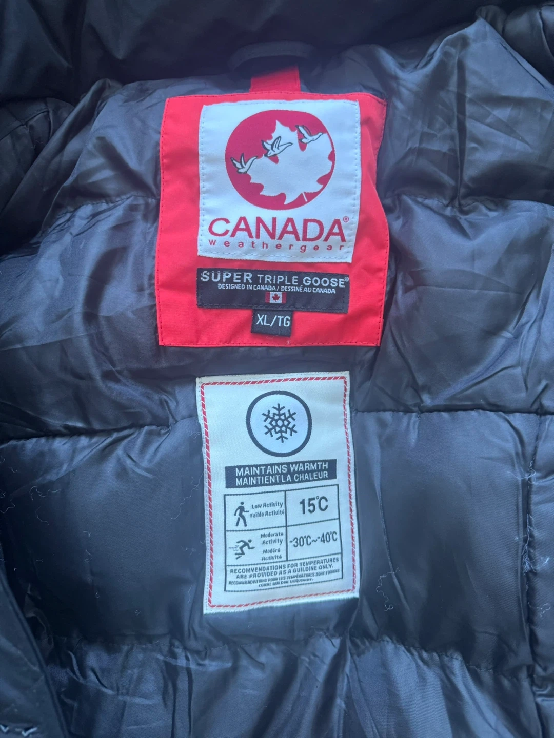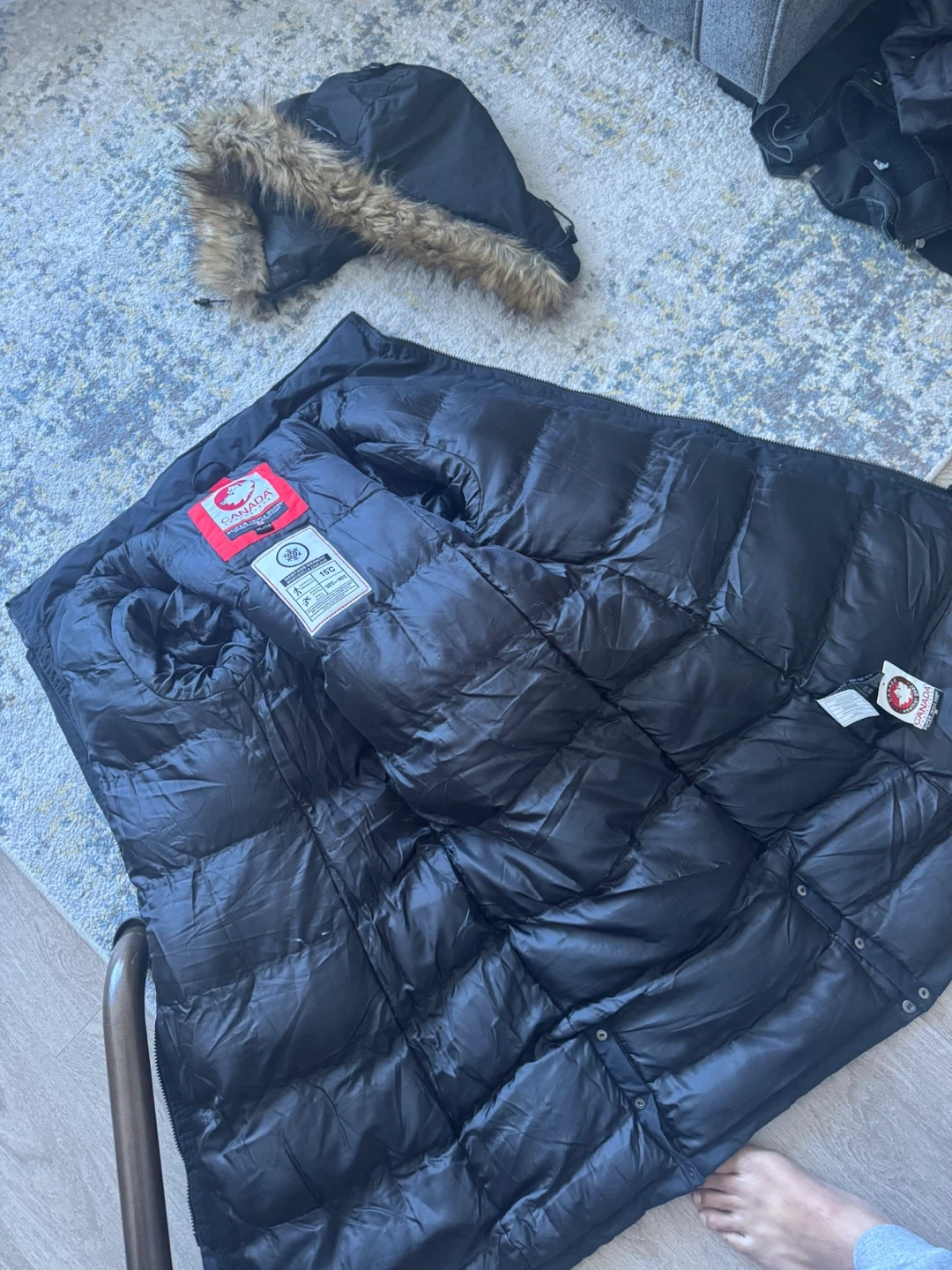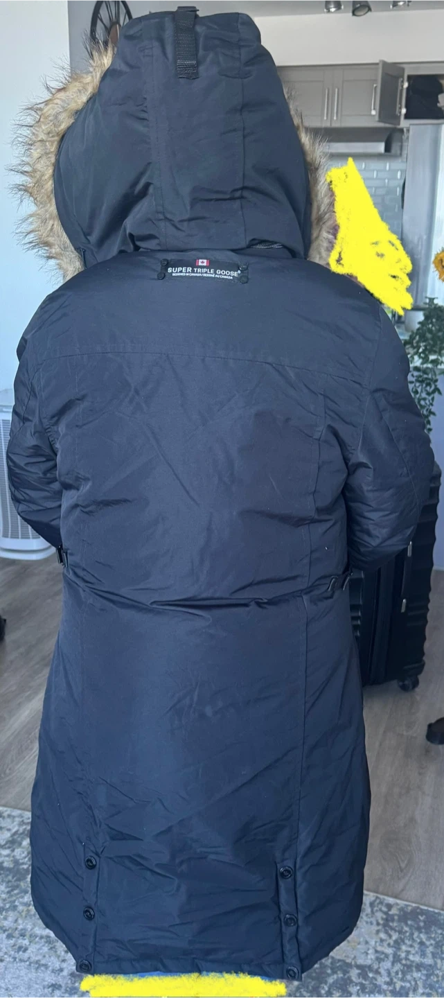 It's in great condition and perfect for the Canadian winter. It features a fur-trimmed hood, a quilted interior, and a long length for extra warmth. The parka also has multiple pockets for storage and is made with high-quality materials