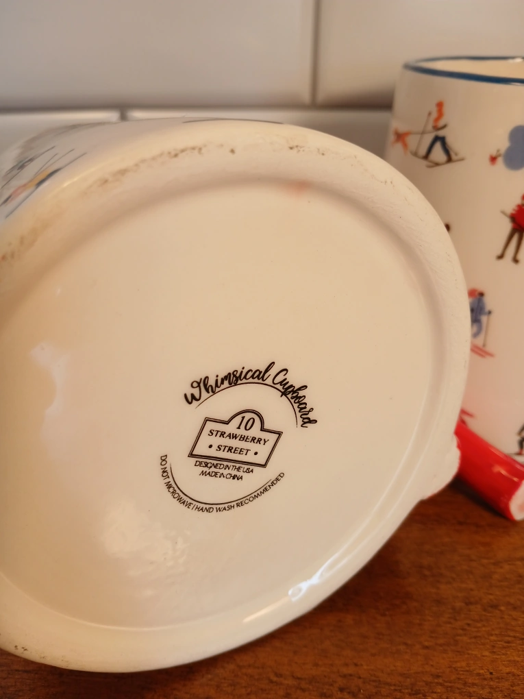 654Fun Ski Mugs for the winter outdoor enthusiasts! Mugs at Whimsical Cupboard "10 Strawberry Street" Wonderful New (no box, never used) condition, I checked "Like New" due to wear from being in my cupboard and moved often, see photo of the bottom. Not microwavable. Hand wash only as these are special!