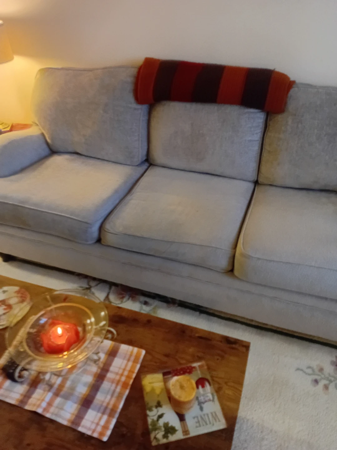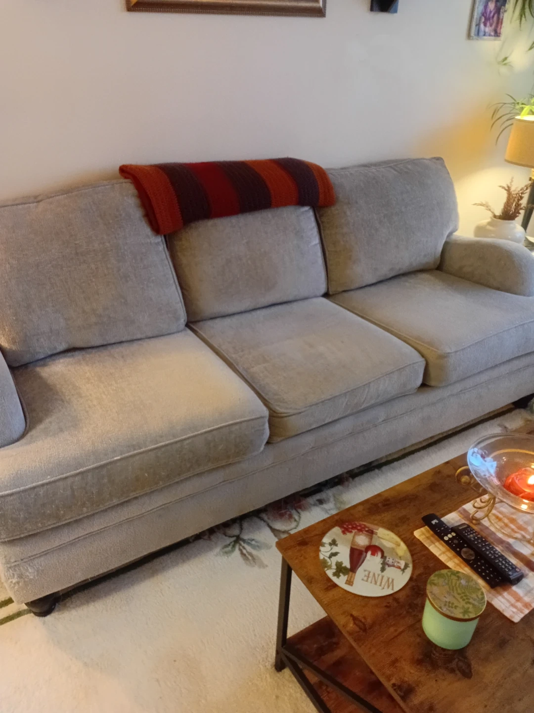 This is a comfortable light grey fabric sofa with three seat cushions. It's perfect for a living room or family room. The sofa has a classic design that fits many decor styles.
