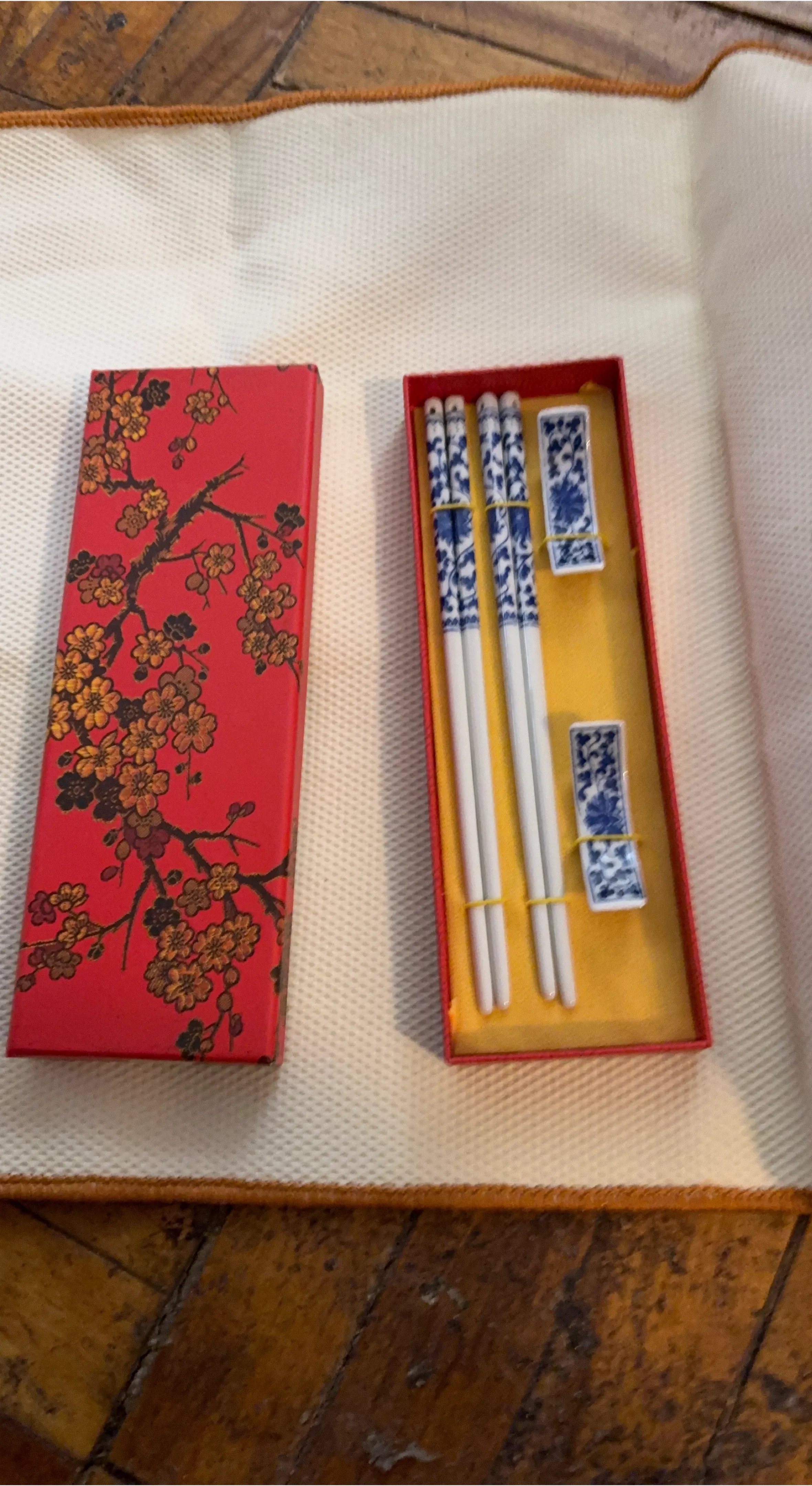 Set of four white chopsticks with blue floral patterns and two matching chopstick rests. Comes in a decorative red floral box. Includes two sets of chopsticks and two rests.