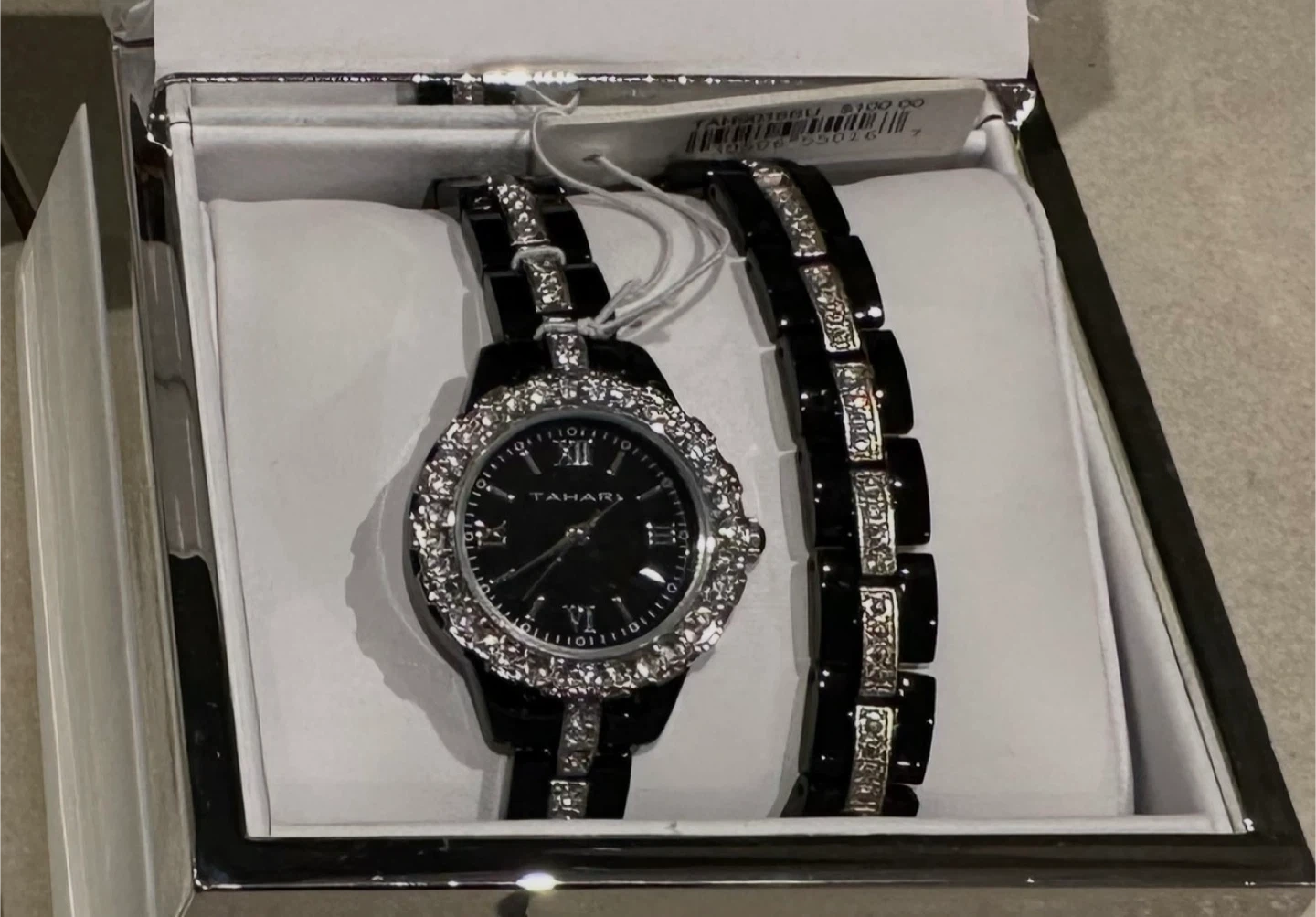 Tahari women's watch and bracelet set. The watch features a black dial with Roman numerals and a crystal-embellished bezel. It's paired with a matching black ceramic link bracelet with crystal accents. Includes original box.