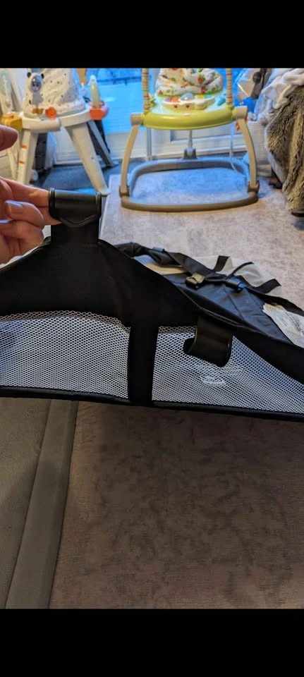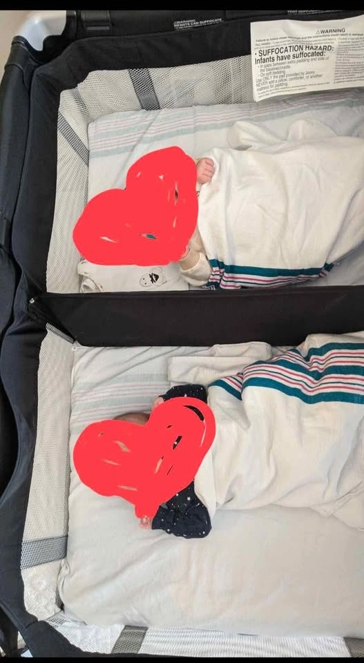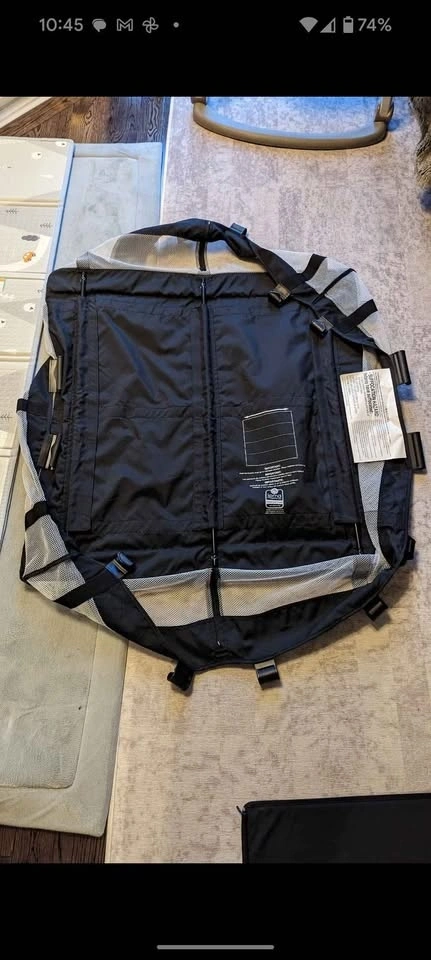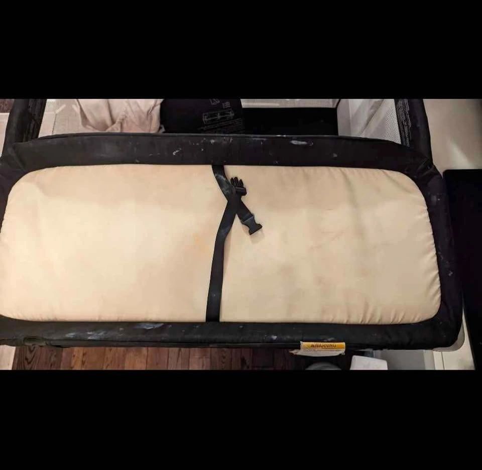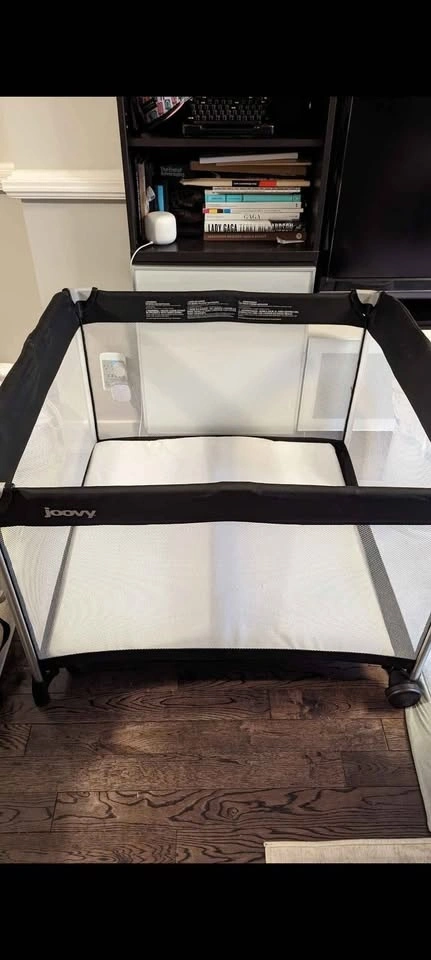 This is a complete set for the Joovy Room 2 playpen, perfect for twins! It includes all the original parts: the large playpen with mesh sides, a bassinet insert with a removable zipper wall divider (sleeps two babies) and a fitted sheet, and a flip-up change table. It's in good condition and has only been used indoors. There are a few white diaper cream marks that might come out with the right cleaner. The playpen measures 40" L x 40" W x 31" H and offers over 10 square feet of space. The mesh siding provides great visibility. It folds up like a traditional playard. A mattress sheet is also included. It's suitable for children up to 35" tall who cannot climb out on their own. Originally retailed for $349.99. Pick up near Greenwood and Danforth.