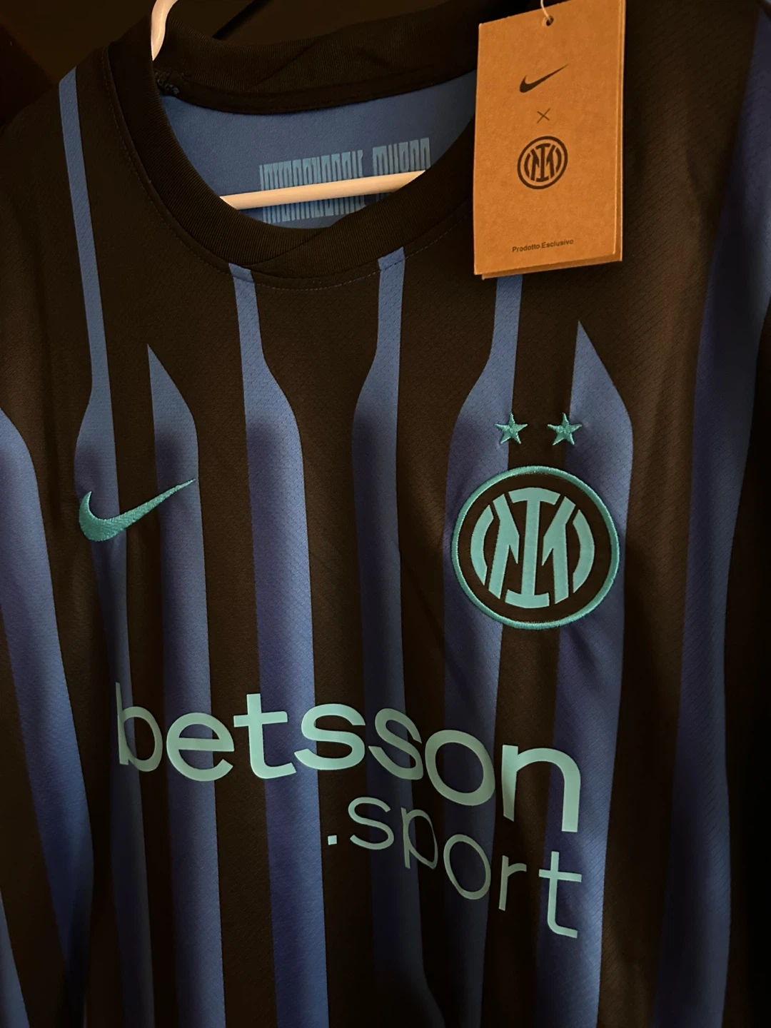 Inter Milan's 2023/24 home jersey with Calhanoglu's name and number 20 on the back. Features the Nike Swoosh and Inter Milan crest. Includes Serie A patch. Dri-FIT technology.