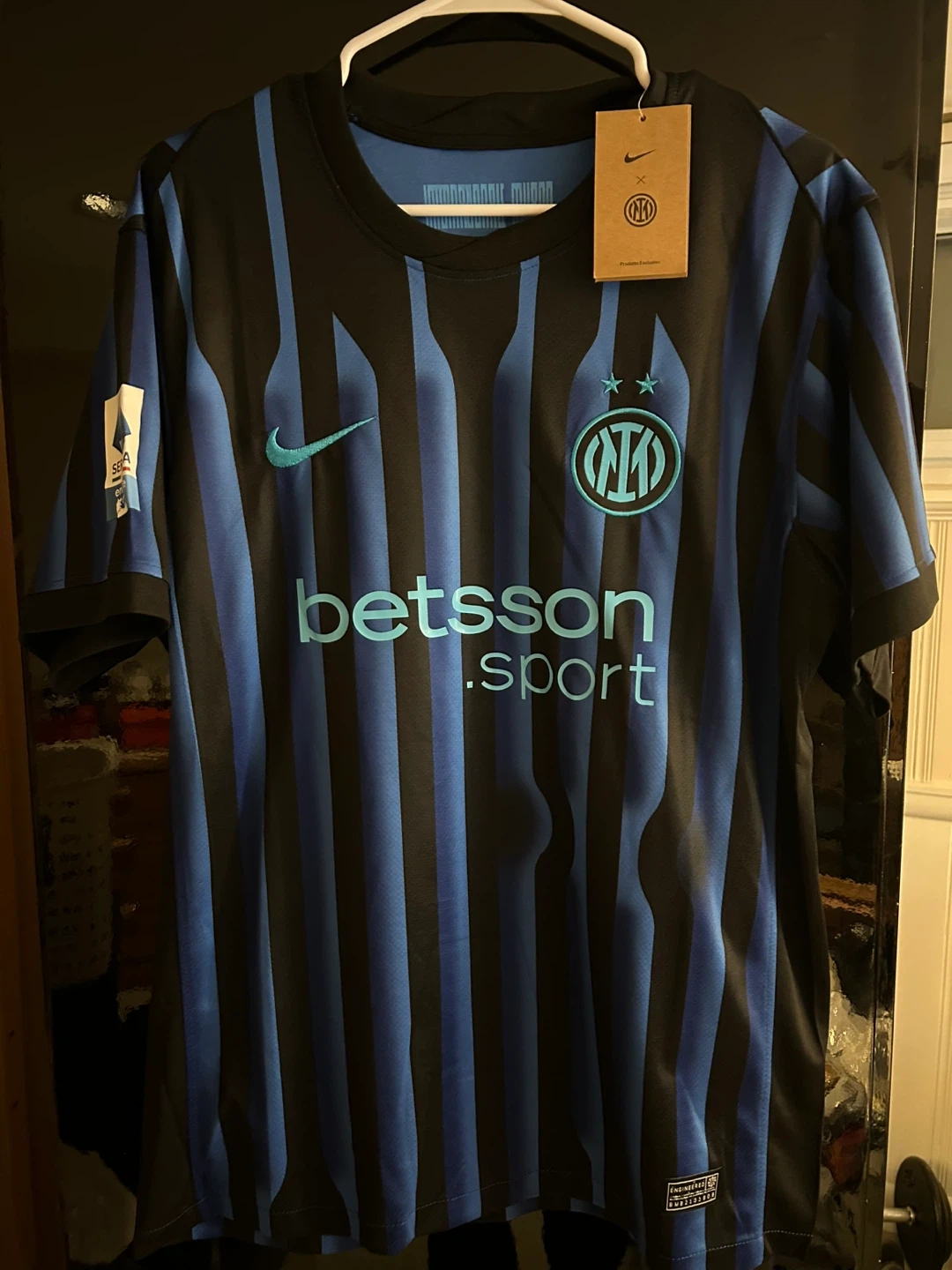 Inter Milan's 2023/24 home jersey with Calhanoglu's name and number 20 on the back. Features the Nike Swoosh and Inter Milan crest. Includes Serie A patch. Dri-FIT technology.