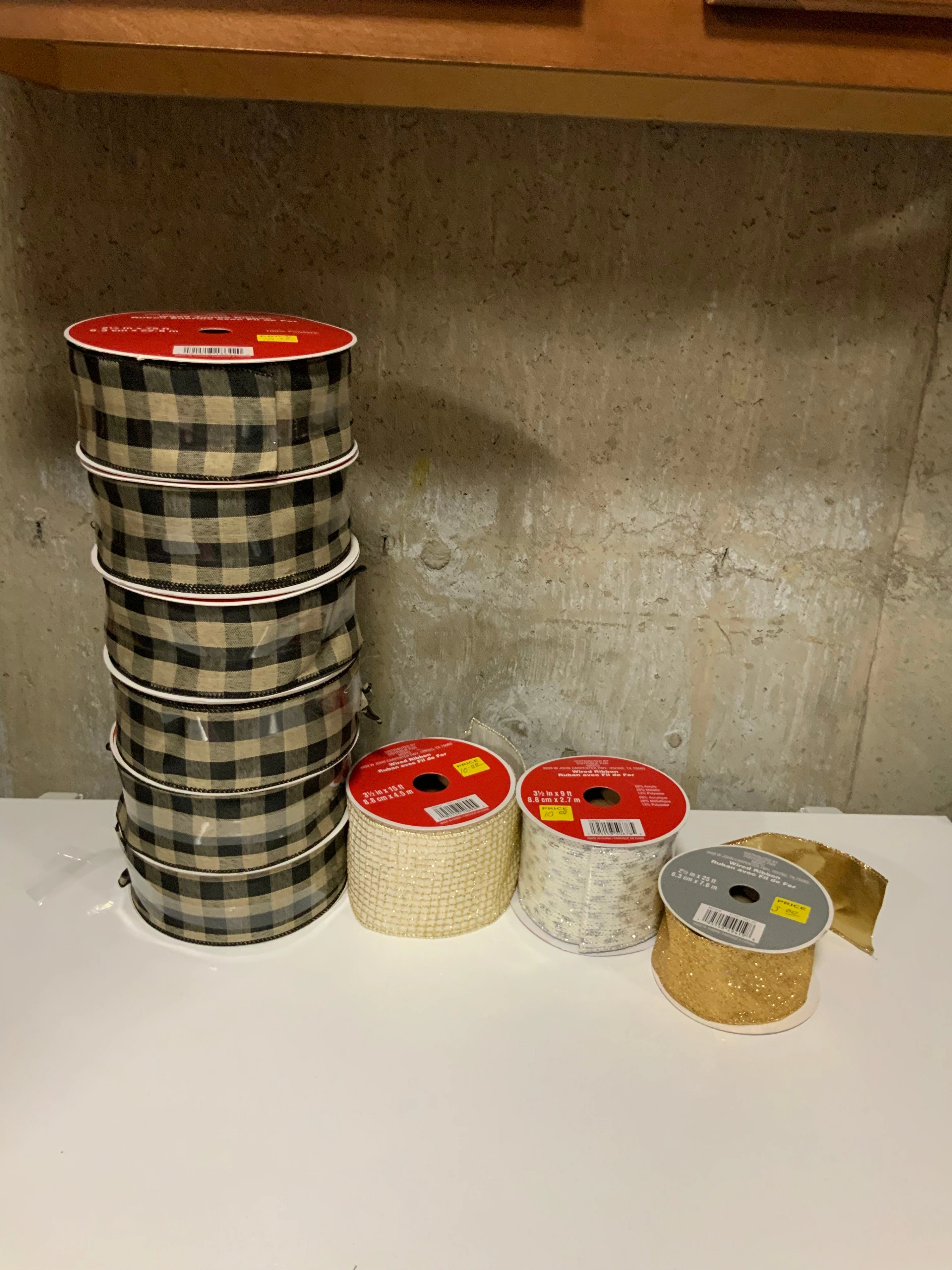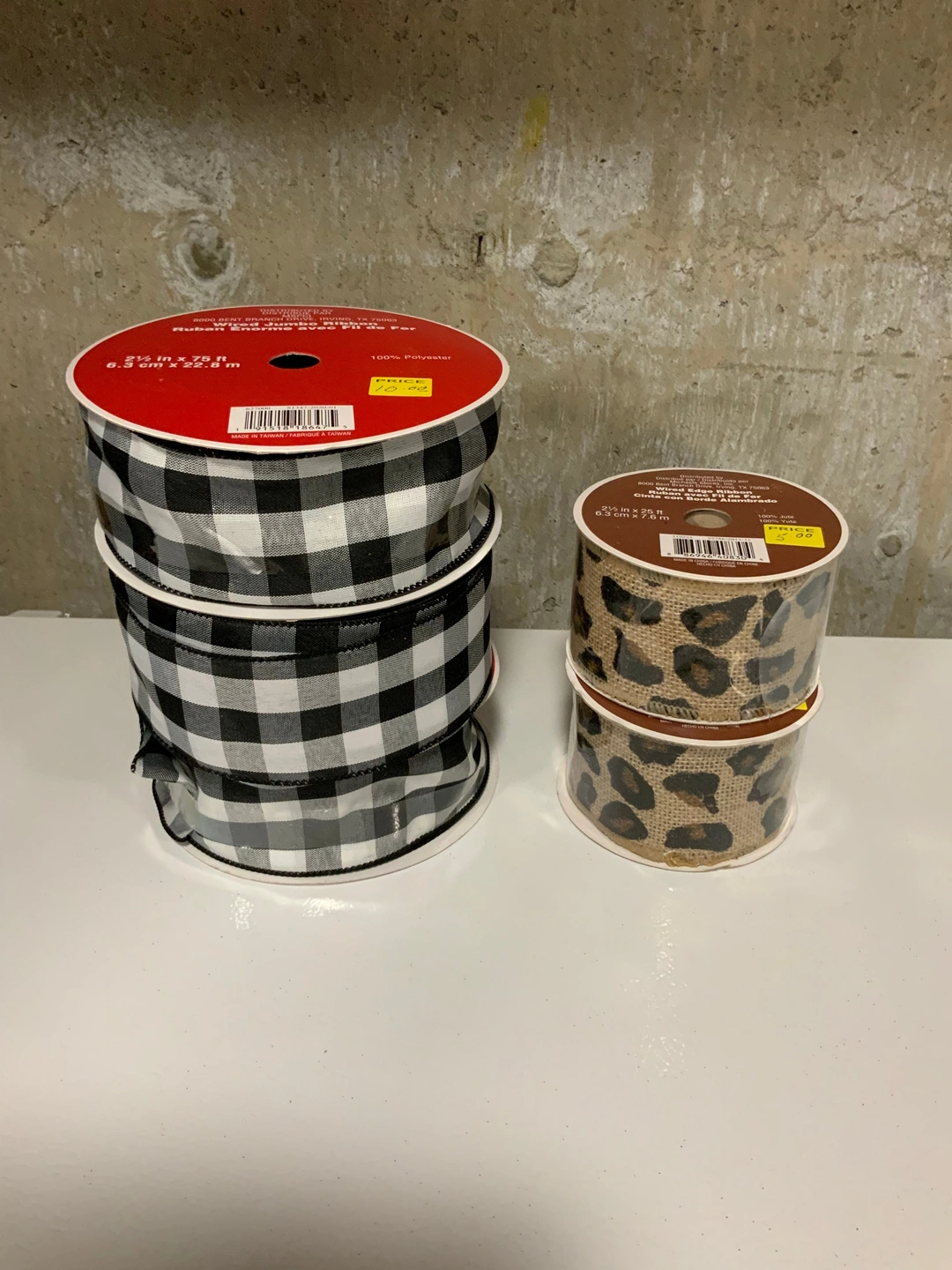 SW Woodlands Rolls of wired fabric ribbon all new never used! Black and Gold checker board with gold sparkles 5 rolls - $8.00 each Gold & White - $5.00 Silver & White - $5.00 Gold - $3.00 Black & White Checker board with silver sparkles - $8.00 each 3 rolls Leopard Print wired jute ribbon - $3.00 each 2 rolls Cash only. No e-transfers