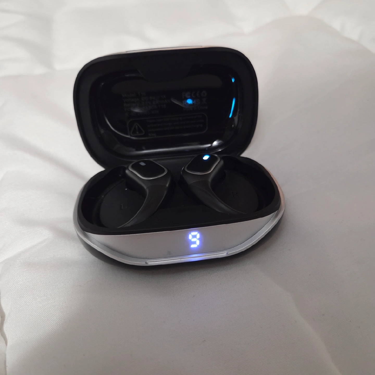 15Selling a pair of wireless earbuds with their charging case. They appear to be in good condition and ready for a new home! The charging case has a digital display to show the battery level.