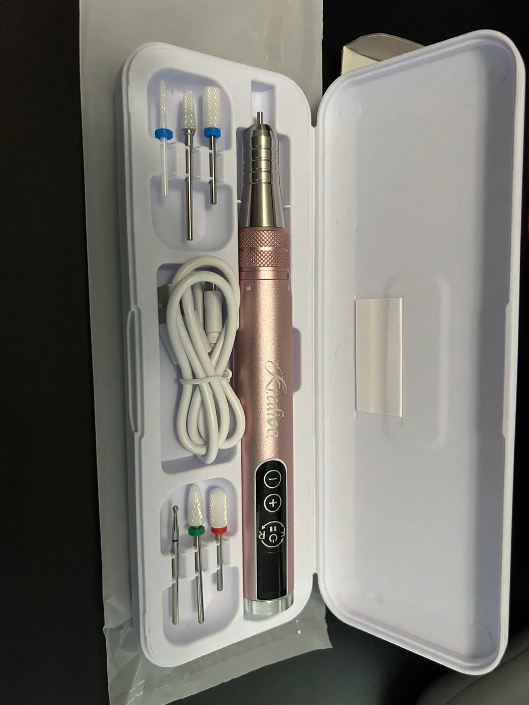 Cordless & Portable & Smart: Kredioo’s latest set of hand-held intelligent cordless integrated pen-shaped nail drill machine takes the guesswork out of getting stuck with short or long cords. And the elaborate LCD display gives you real-time control of the machine's speed, forward and reverse rotation. Likewise, the compact electric nail file, weighing only 0.34 lbs, has made freestyle nail art a reality! Let's say goodbye to "body+handpiece" nail drill! Powerful & Professional & Rechargeable: Equipped with powerful bearings and motors, with 1000mAh high-grade rechargeable lithium-ion battery. Wireless use for 5h straight after a 2h full charge(5V 2A charger is recommended). While high precision and concentricity ensure the stability of the conversion process from low speed to high speed (35,000rpm). This makes efile the perfect choice for nail pros just starting to use drills, as it is less likely to damage your nails. High Performance & Low Heat & Low Vibration: Durable stainless steel shell, aluminum alloy body and cooling system function can quickly dissipate heat. Masterful engineering technology provides quiet and non-vibration performance for nail drills. To a great extent, with this electric nail drill to solve all your manicure and pedicure problems and to give your nails a professional look. Multi-purpose Ceramic Bits & Twist-Lock System: Made of the highest precision and premium ceramic and diamond carbide material, it has excellent strength, sharpness, durability. The thin shank and ceramic head reduce vibration, friction and heat when rotating, thus helping to effectively grind, carve, cut and polish acrylic gel nails. However, the bit lock system allows you to easily change the drill bit while preventing it from falling out and keeping you safe. Ergonomic Design & Self-Protection Mechanism: After repeated testing and design, Kredioo's electric nail file fits the natural shape of the hand to the maximum. Without active adaptation, the recessed front allows you to use it without feeling the strain at all. Drill bit stops spinning and "00" displays on the screen when great resistance is encountered or the handpiece is not well locked, which plays a role in protecting the motor and prolonging machine life.