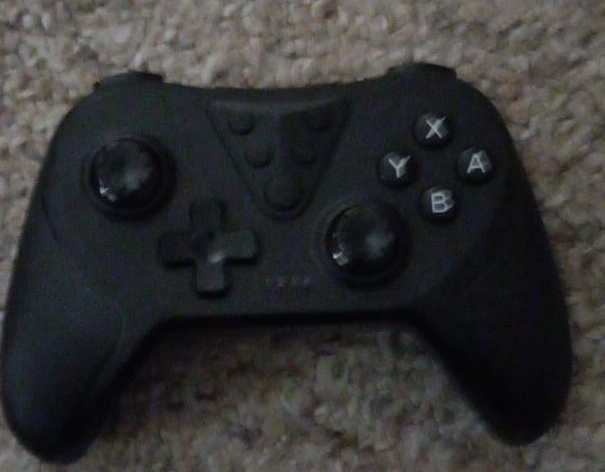 Black wireless game controller. Compatible with Nintendo Switch. Features analog sticks, directional pad, and ABXY buttons.