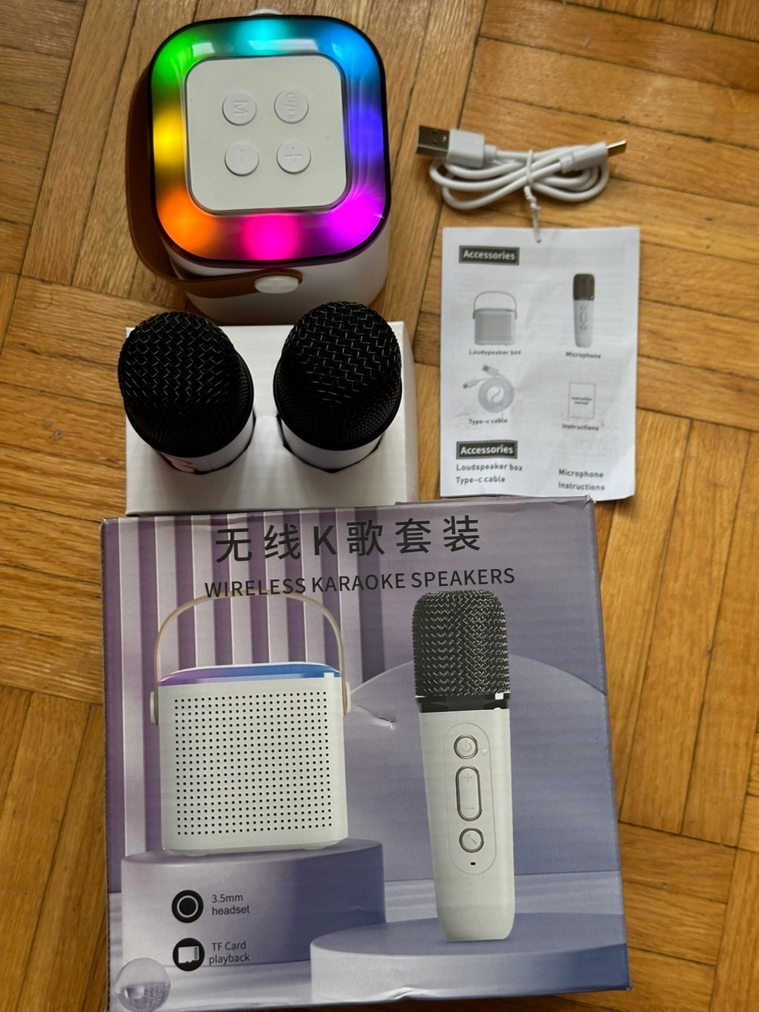 Get ready to sing your heart out with this wireless karaoke speaker set! It comes with two microphones, a loudspeaker box, and a Type-C cable. The set also includes a 3.5mm headset jack and TF card playback. The box and instructions are included too!