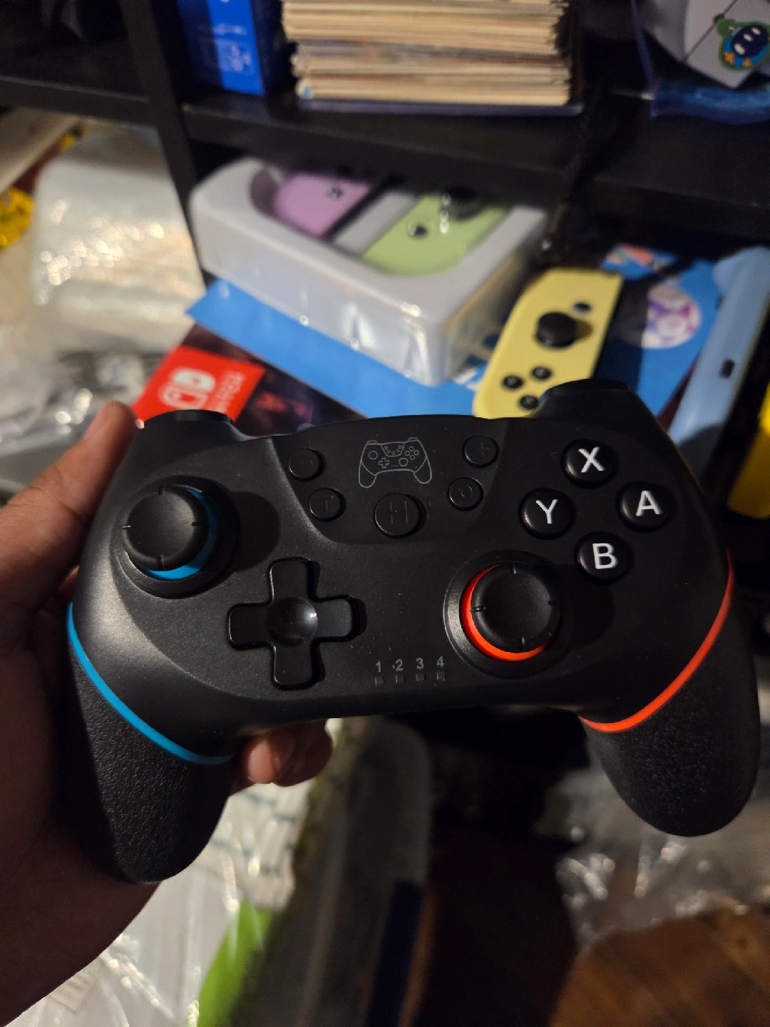 130Selling a wireless controller for Nintendo Switch. It's black with blue and red accents on the grips. Great condition!