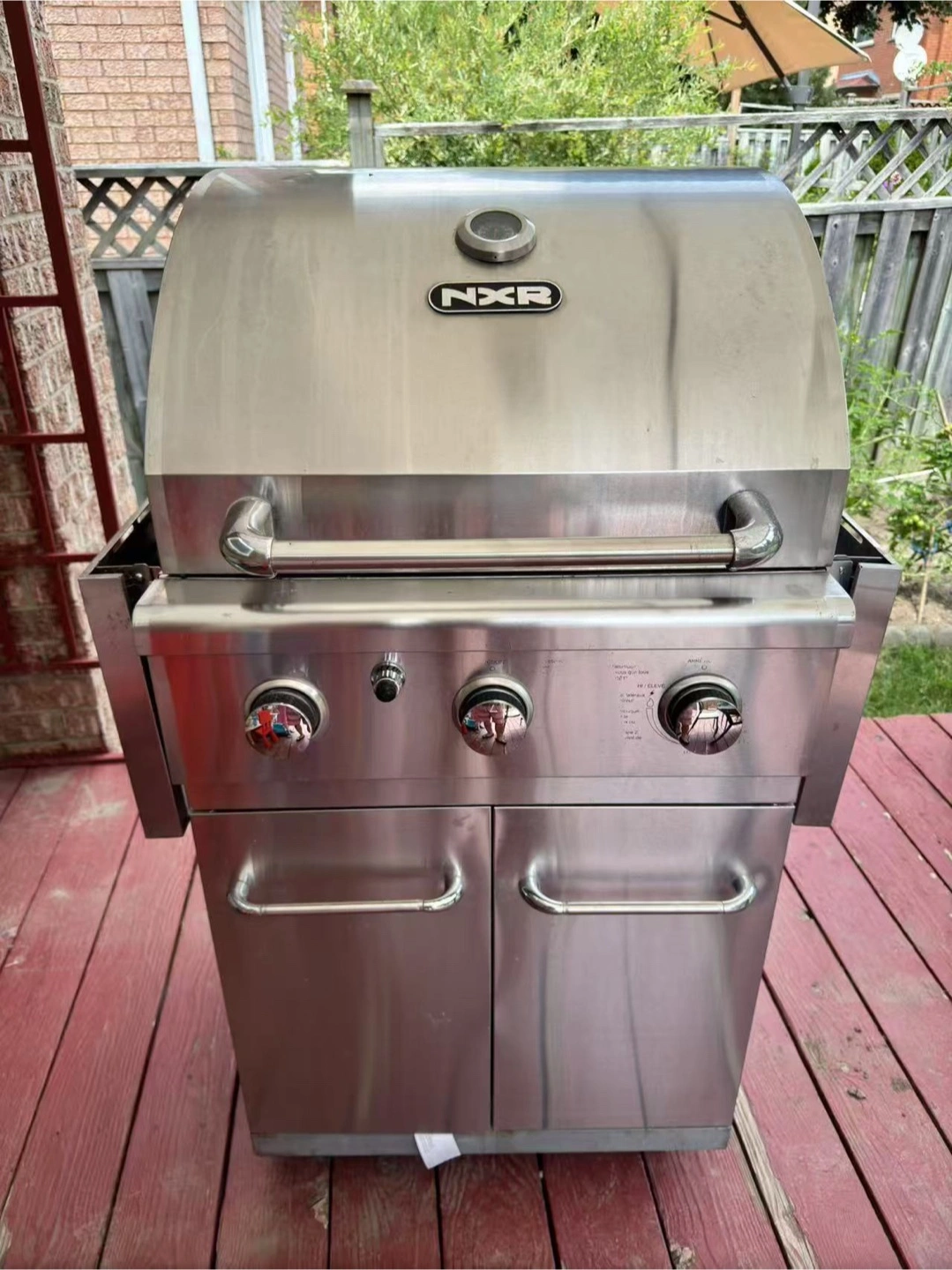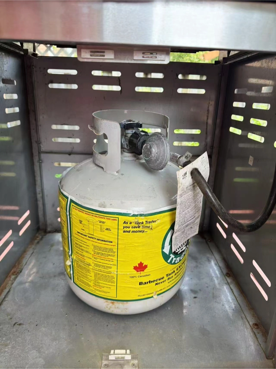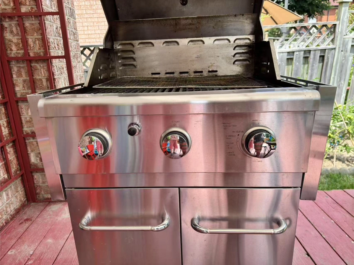 Stainless steel propane BBQ. Three burners. Tank included. Good condition. Minor wear.