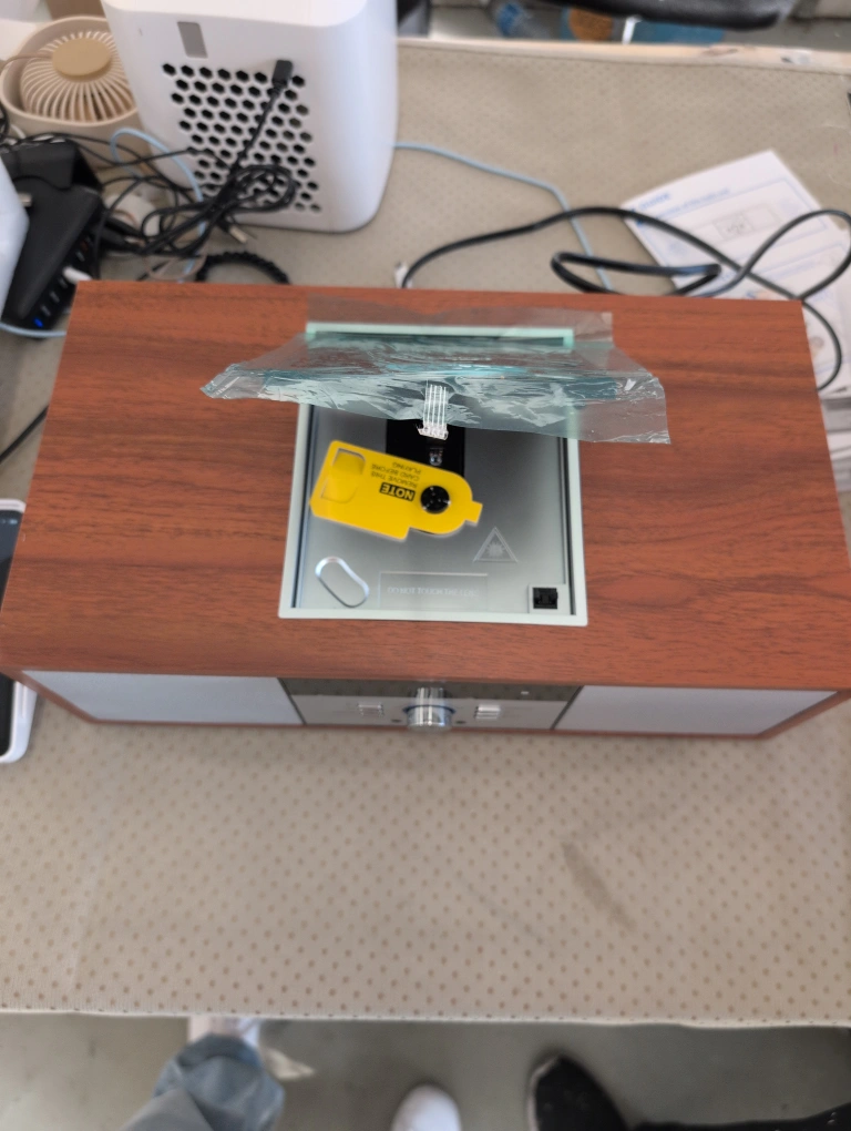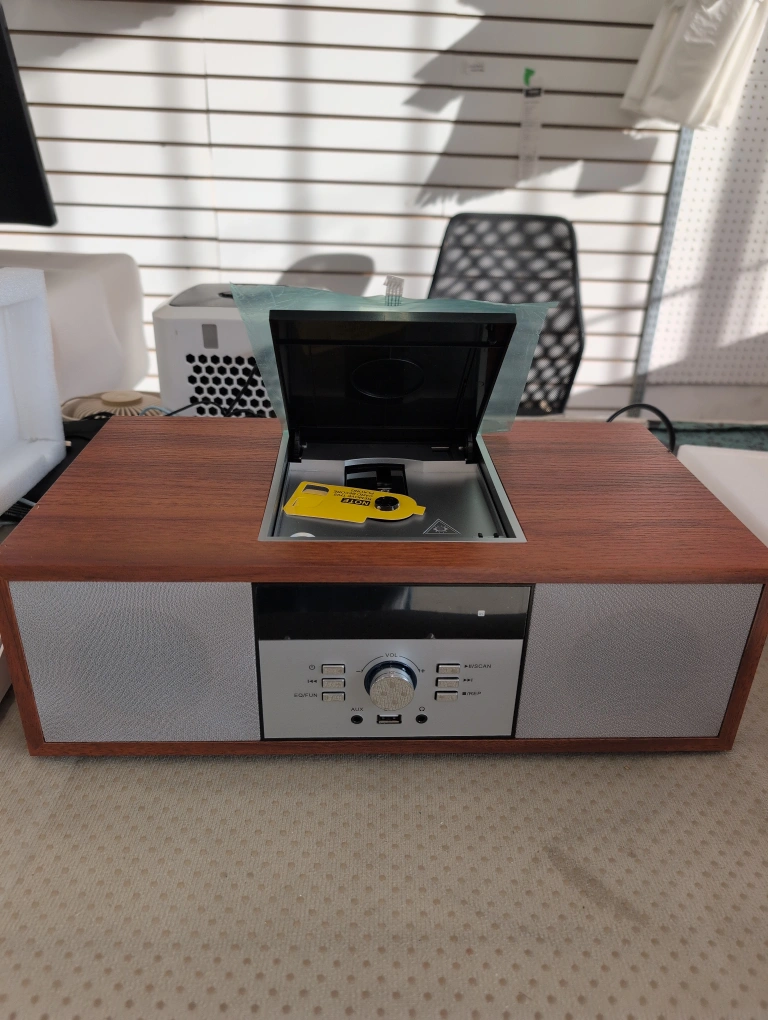 Selling a NOTE branded wooden CD player! It's in great shape and ready to play your favourite tunes. It has a classic look that would fit well in any room