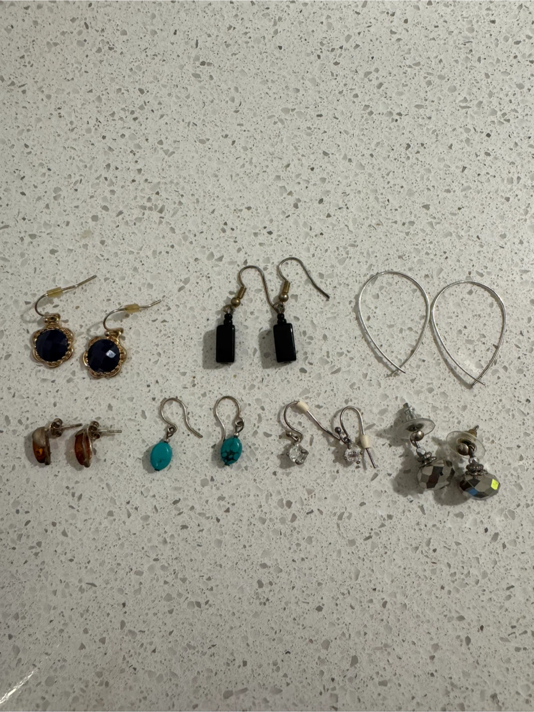 This is a bundle of assorted earrings. It includes dangle earrings, stud earrings, and hoops. A pair of amber sterling silver earrings are included. Need to be polished.