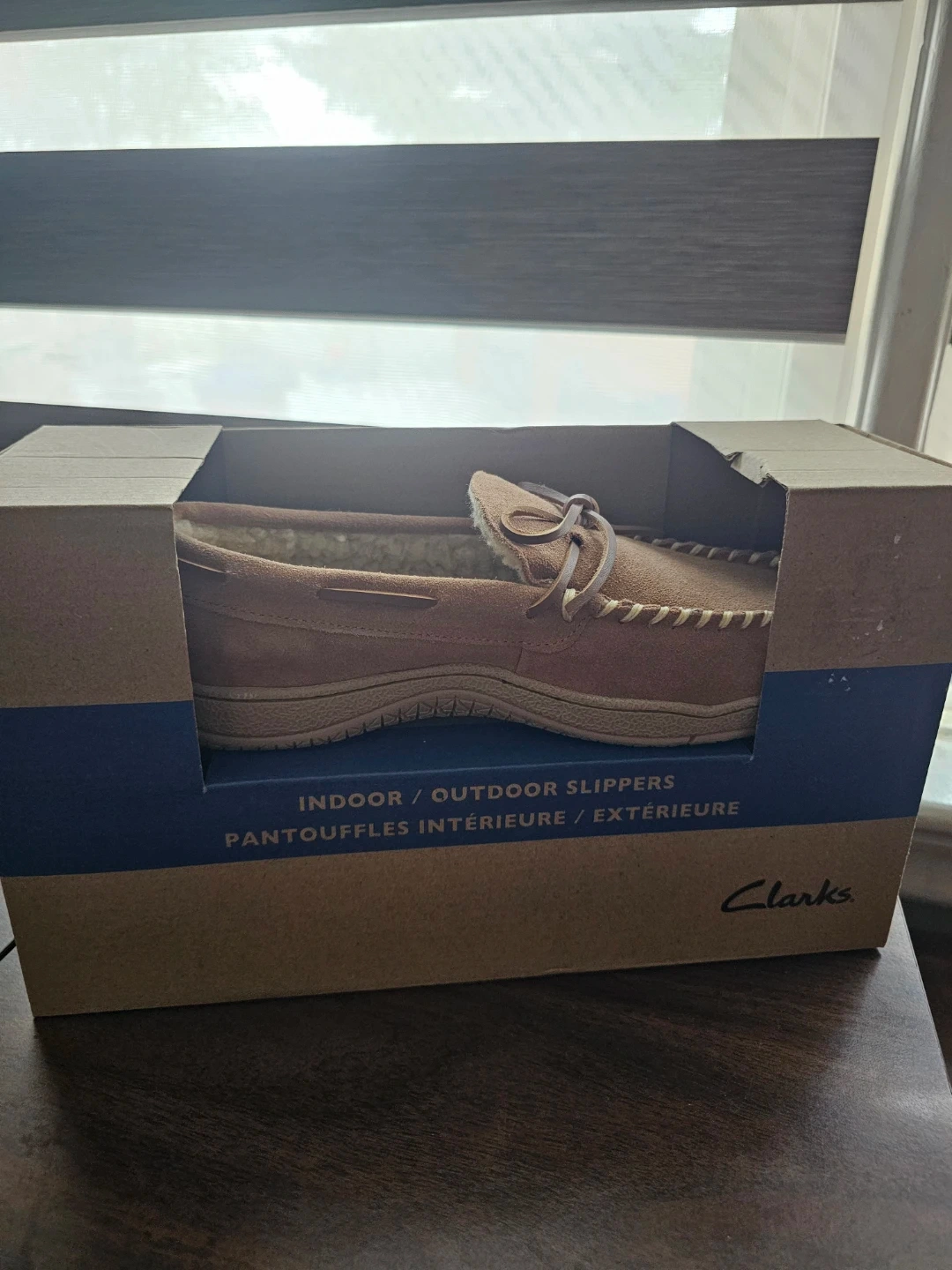 Clarks men's cow suede moccasin slippers in cinnamon. These indoor/outdoor slippers feature a cozy sherpa lining and a decorative bow.