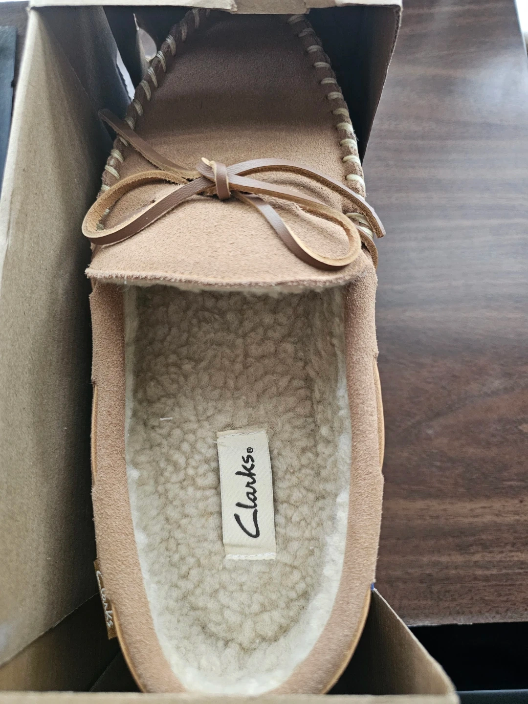 Clarks men's cow suede moccasin slippers in cinnamon. These indoor/outdoor slippers feature a cozy sherpa lining and a decorative bow.