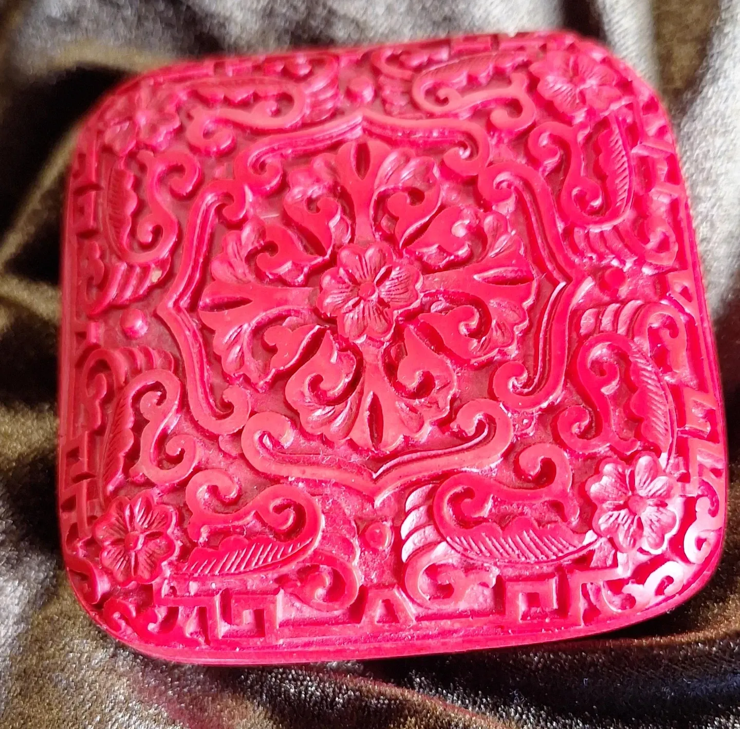 This decorative box features intricate floral and scroll carvings. Its vibrant red colour and detailed design make it a striking piece. It's perfect for holding small trinkets or as a standalone decorative item. Contains Lip Stain paper, a Chinese cosmetic, in a brave bold red shade similar to the colour of the box.