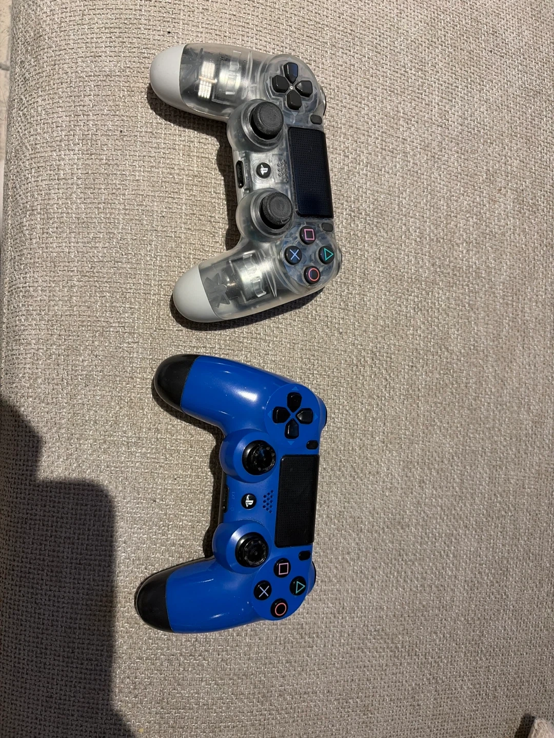 Includes one clear and one blue Sony DualShock 4 wireless controller. Both are for the PlayStation 4 system. They connect wirelessly.
