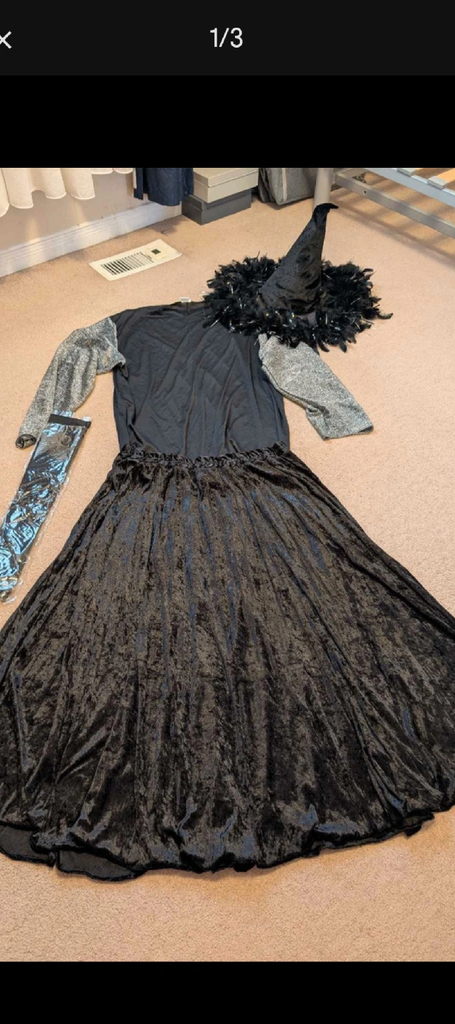 Selling a witch costume that includes a long black velvet-like skirt, a black and silver top, a witch hat with black feathers, and long black gloves. Perfect for Halloween or dress-up! Hat and gloves are brand new Skirt and top worn once skirt bought at reitman's