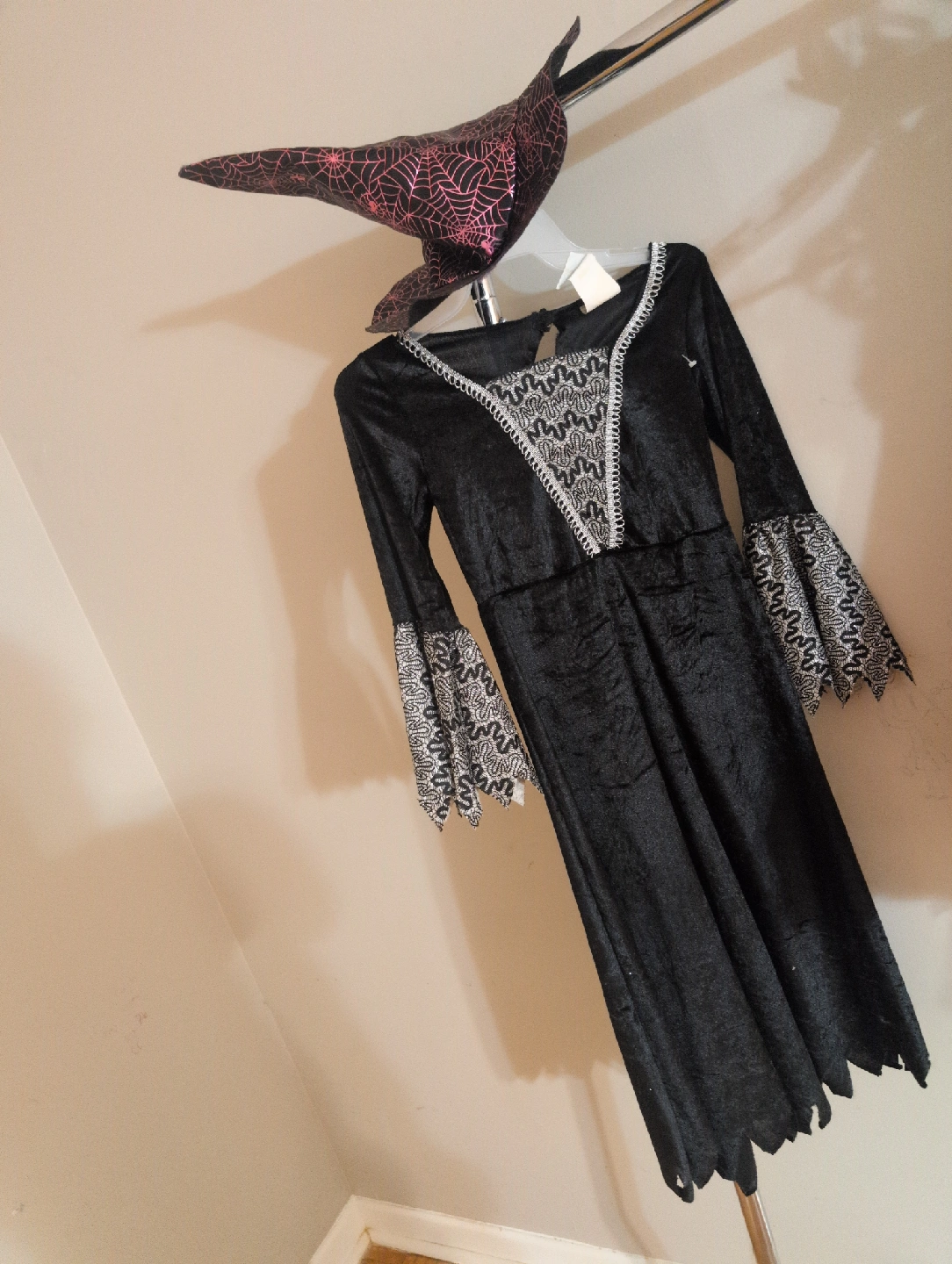 15Selling a witch costume that comes with a matching hat! The dress is black with silver accents and bell sleeves. Perfect for Halloween or dress-up!