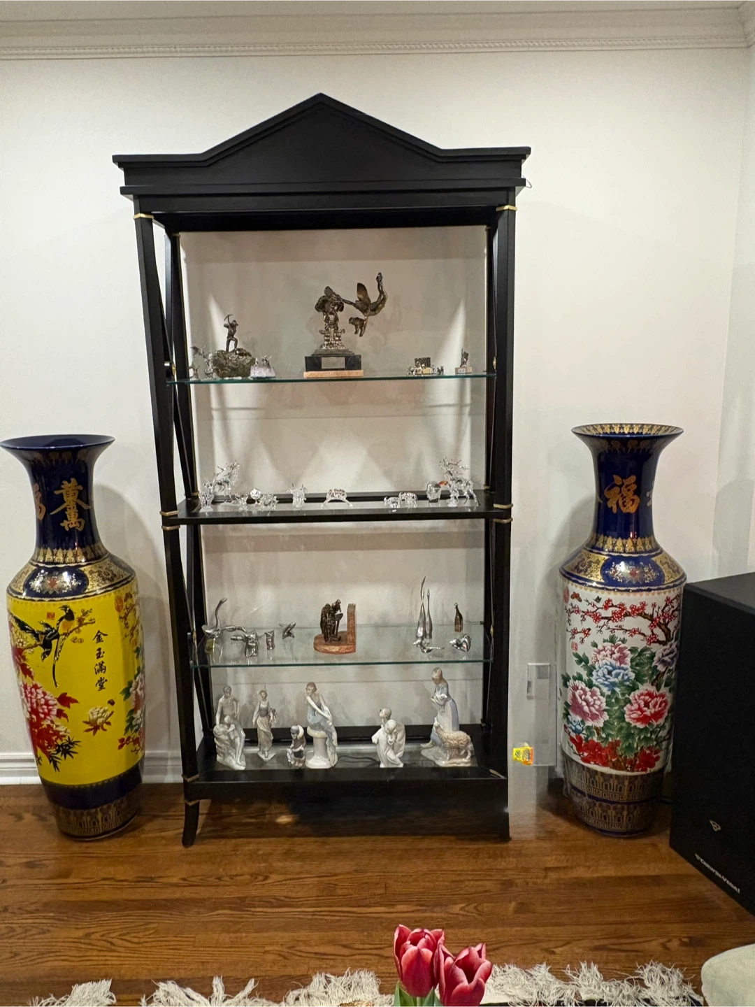 Two striking large oriental vases, perfect for adding a touch of elegance to any room. One features a vibrant yellow base with birds and floral motifs, while the other showcases a white base with detailed floral designs. They're both finished with a rich blue neck and ornate gold detailing. These statement pieces will certainly catch the eye!