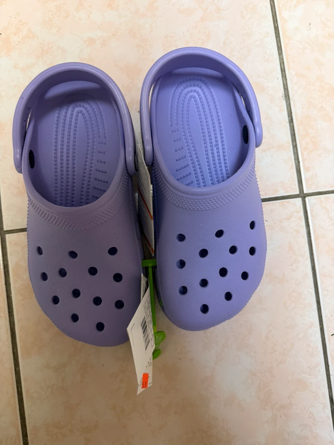 These are a pair of Crocs Classic Clogs in a light purple lavender colour. They are a women's size 7. Made in India. Perfect for casual wear!