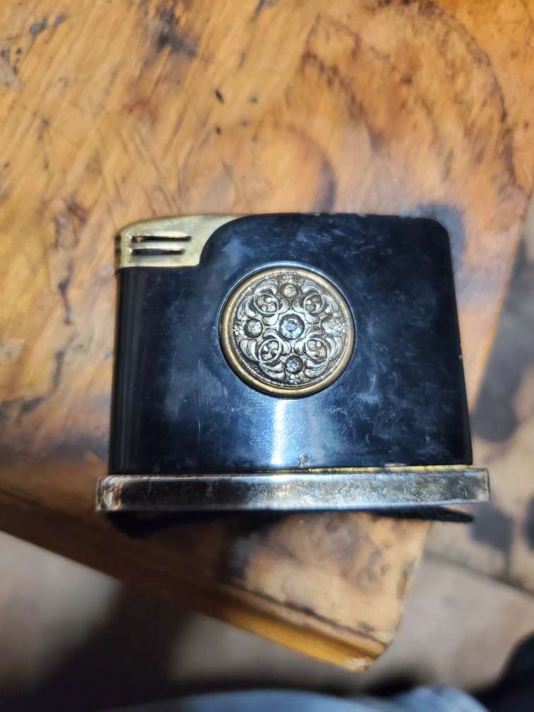 Here's a vintage table lighter. It features a black body with gold accents and a decorative medallion on the front. It shows some signs of wear consistent with its age, but it could be a great addition to a collection or a unique piece for your home!