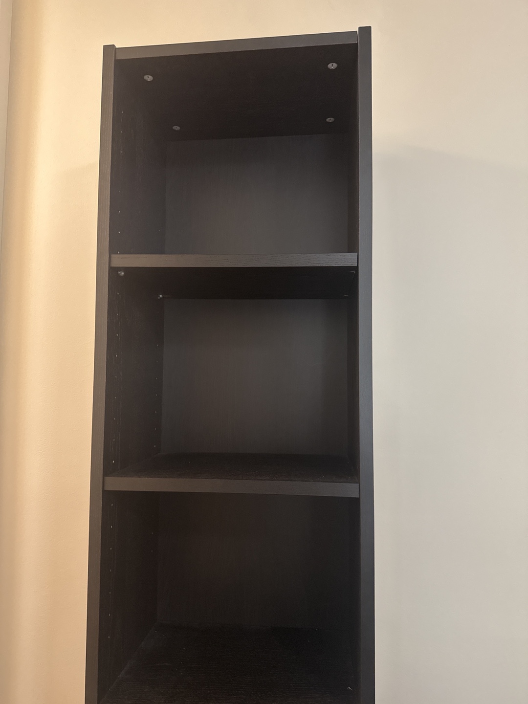 Selling a tall bookshelf in black. It has multiple shelves, perfect for books or displaying items. It's in great shape and ready for a new home!