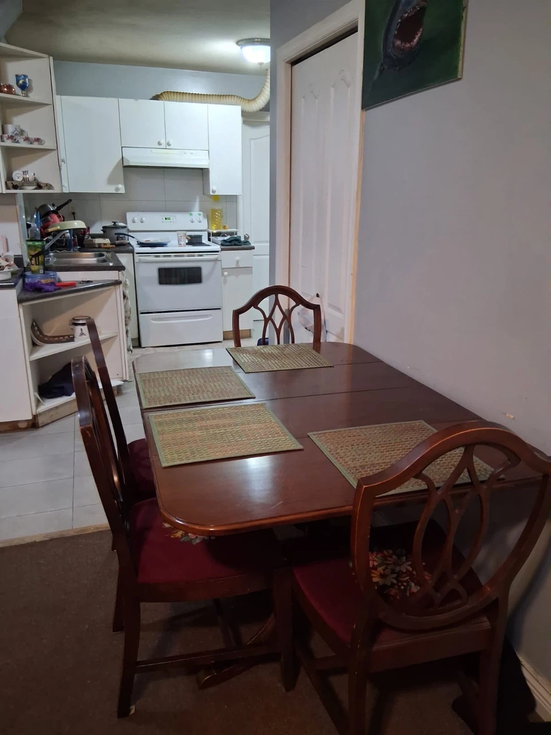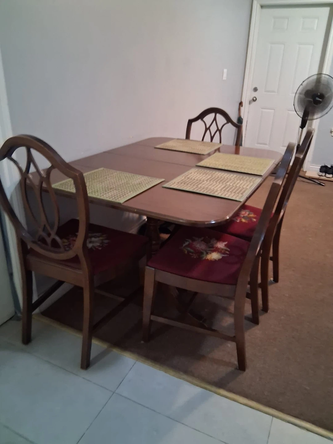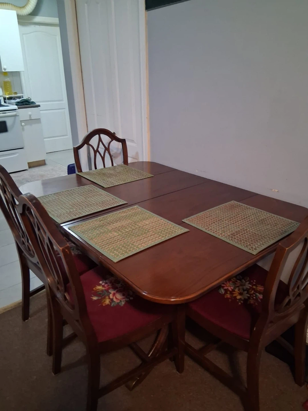A classic wooden dining table with four matching chairs. It's perfect for smaller dining areas or kitchens. Includes placemats shown.